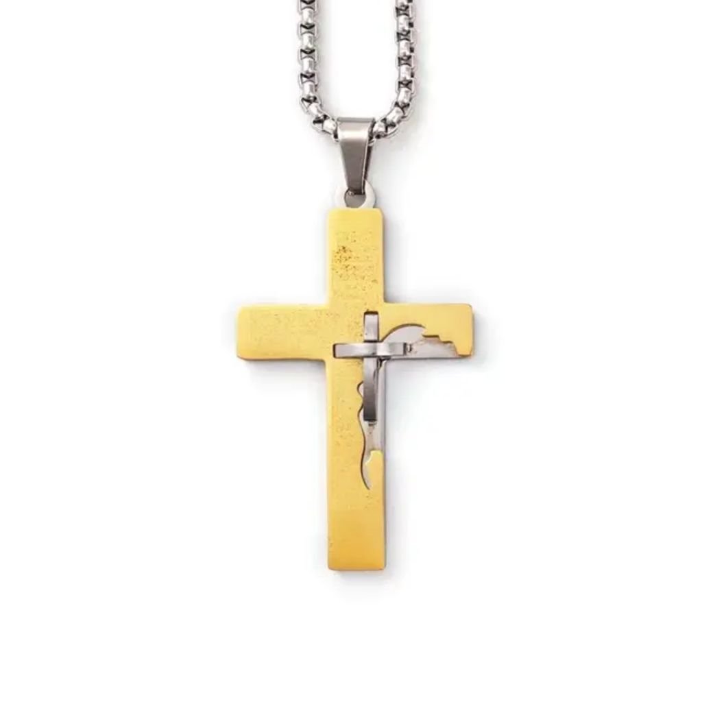 Εντυπωσιακό ανδρικό κολιέ με σταυρό από ανοξείδωτο ατσάλι σε δίχρωμο φινίρισμα (χρυσό & ασημί).