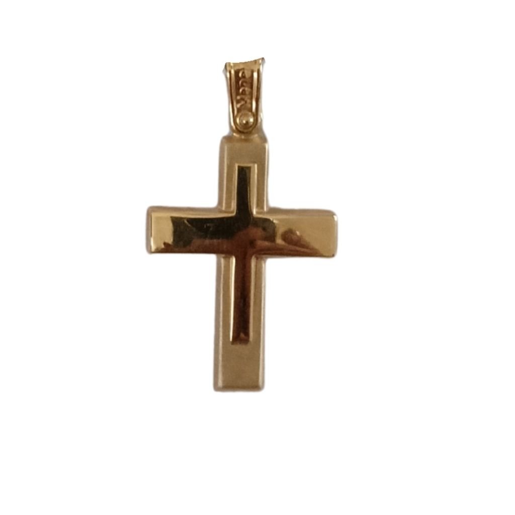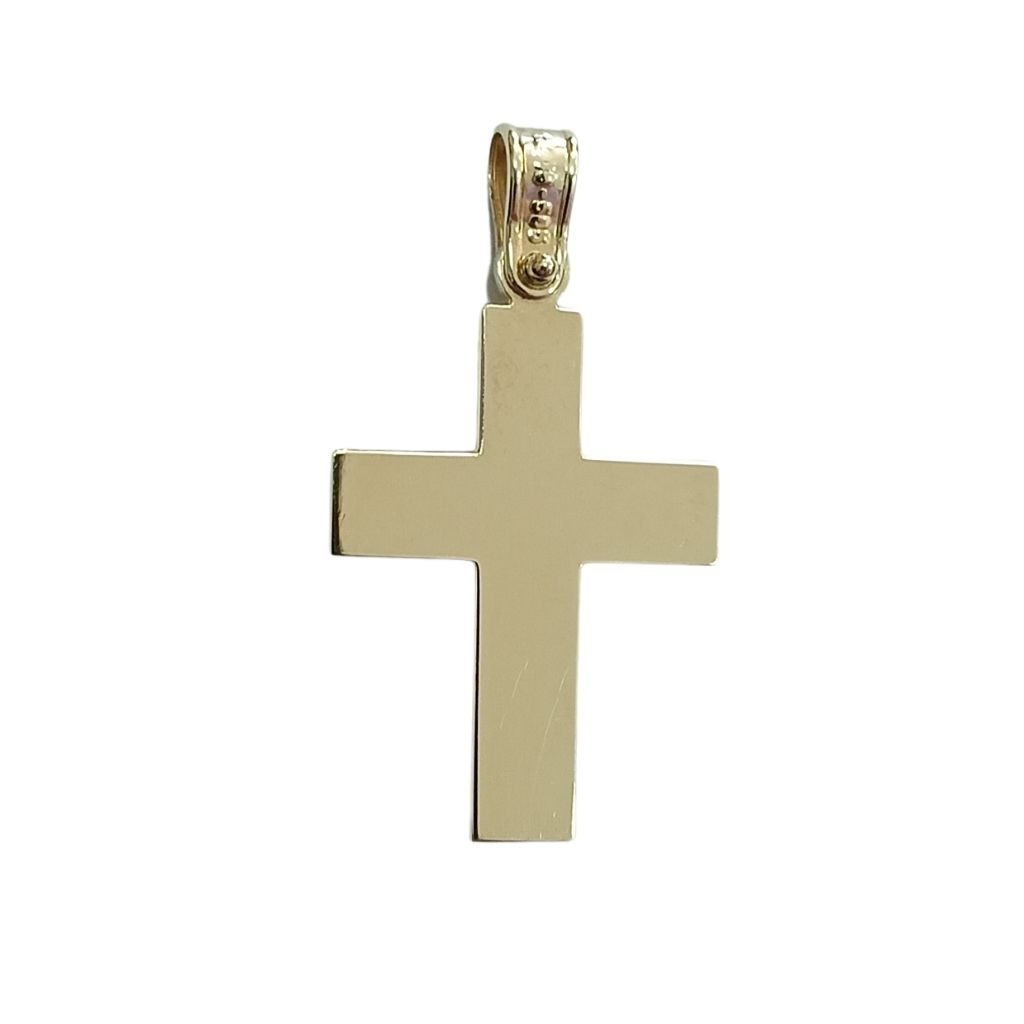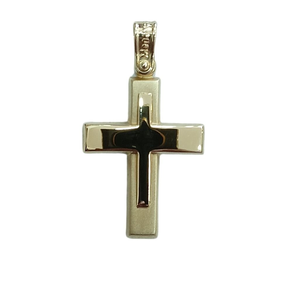 Ανδρικός σταυρός 14 καρατίων από χρυσό, με κομψή δίχρωμη εμφάνιση. Ο εσωτερικός σταυρός έχει γυαλιστερό φινίρισμα, ενώ η εξωτερική επιφάνεια διαθέτει σατινέ υφή, δημιουργώντας μία διακριτική αλλά εντυπωσιακή αντίθεση.