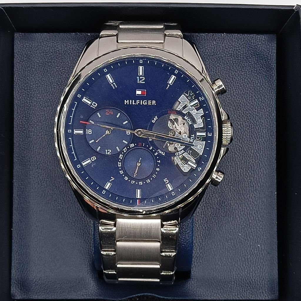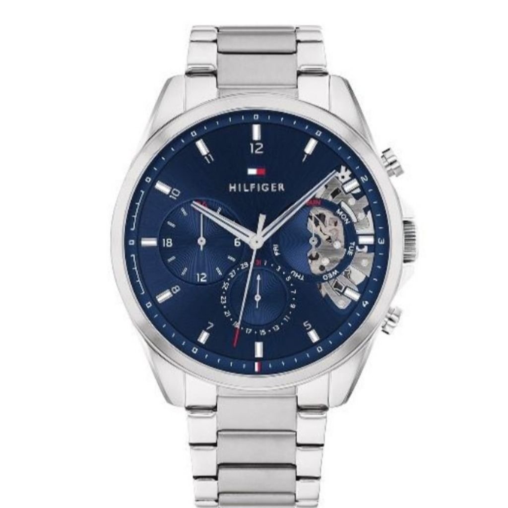 Κομψό και μοντέρνο ανδρικό ρολόι Tommy Hilfiger με μπρασελέ από ανοξείδωτο ατσάλι και μπλε καντράν. Εντυπωσιακή λεπτομέρεια skeleton στο εσωτερικό που αποκαλύπτει μηχανικά στοιχεία. Συνδυάζει κομψότητα και τεχνολογική ακρίβεια.