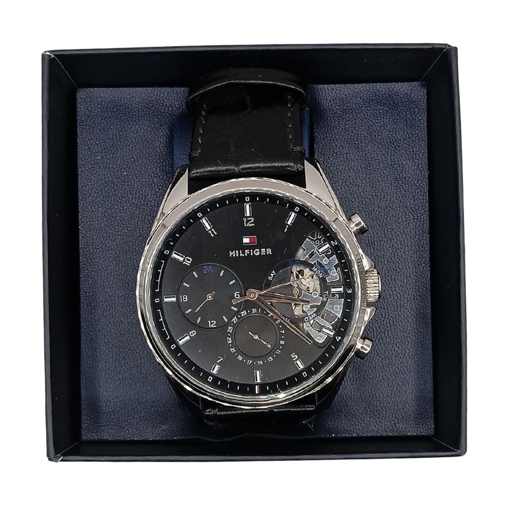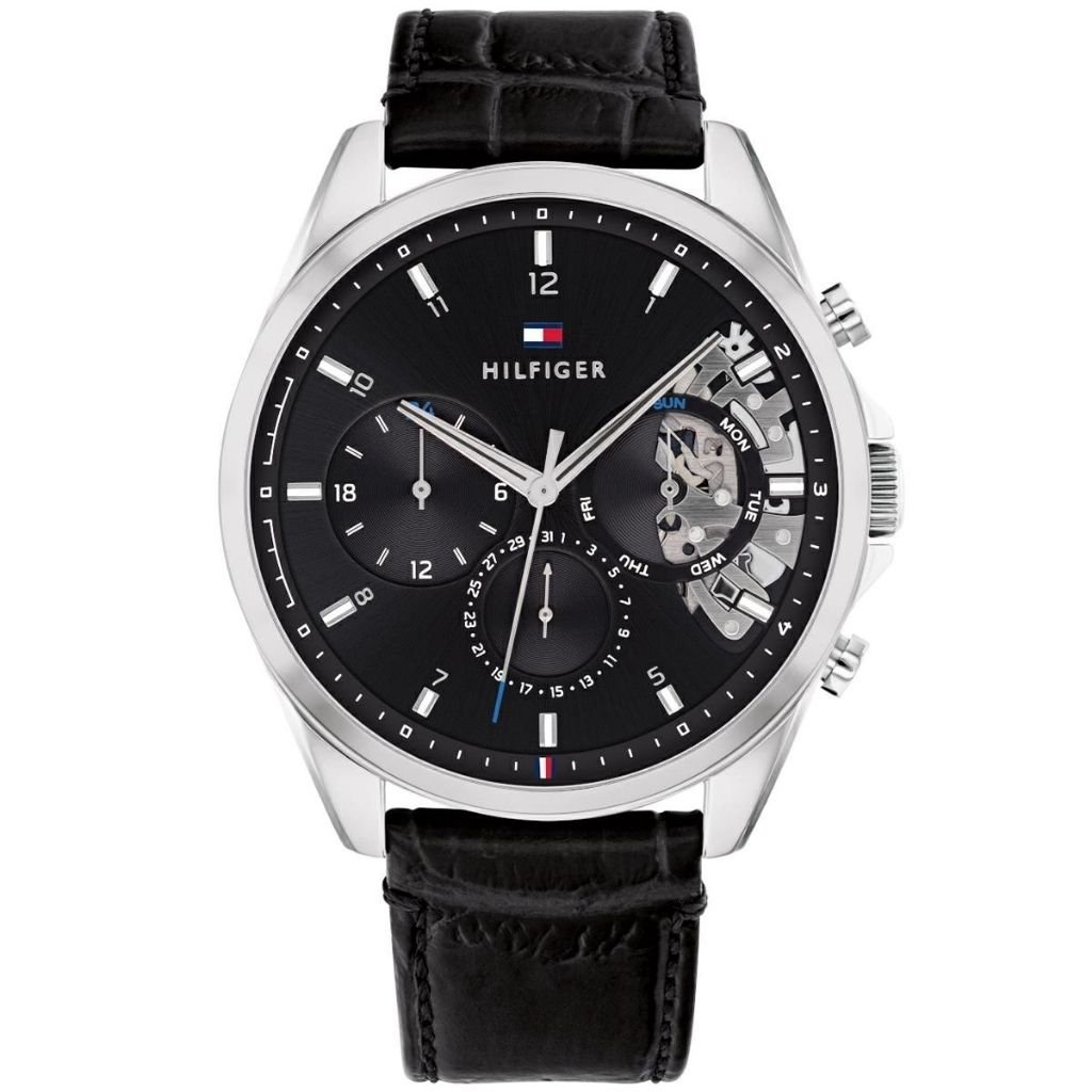 Εντυπωσιακό ανδρικό ρολόι Tommy Hilfiger με μαύρο καντράν που αποκαλύπτει διακριτικά τον μηχανισμό του (skeleton) για μια μοντέρνα πινελιά πολυτέλειας. Το μαύρο δερμάτινο λουράκι και οι ασημί λεπτομέρειες ολοκληρώνουν τον κομψό χαρακτήρα του. Ανθεκτικό στο νερό έως 5 ATM για άνετη καθημερινή χρήση.