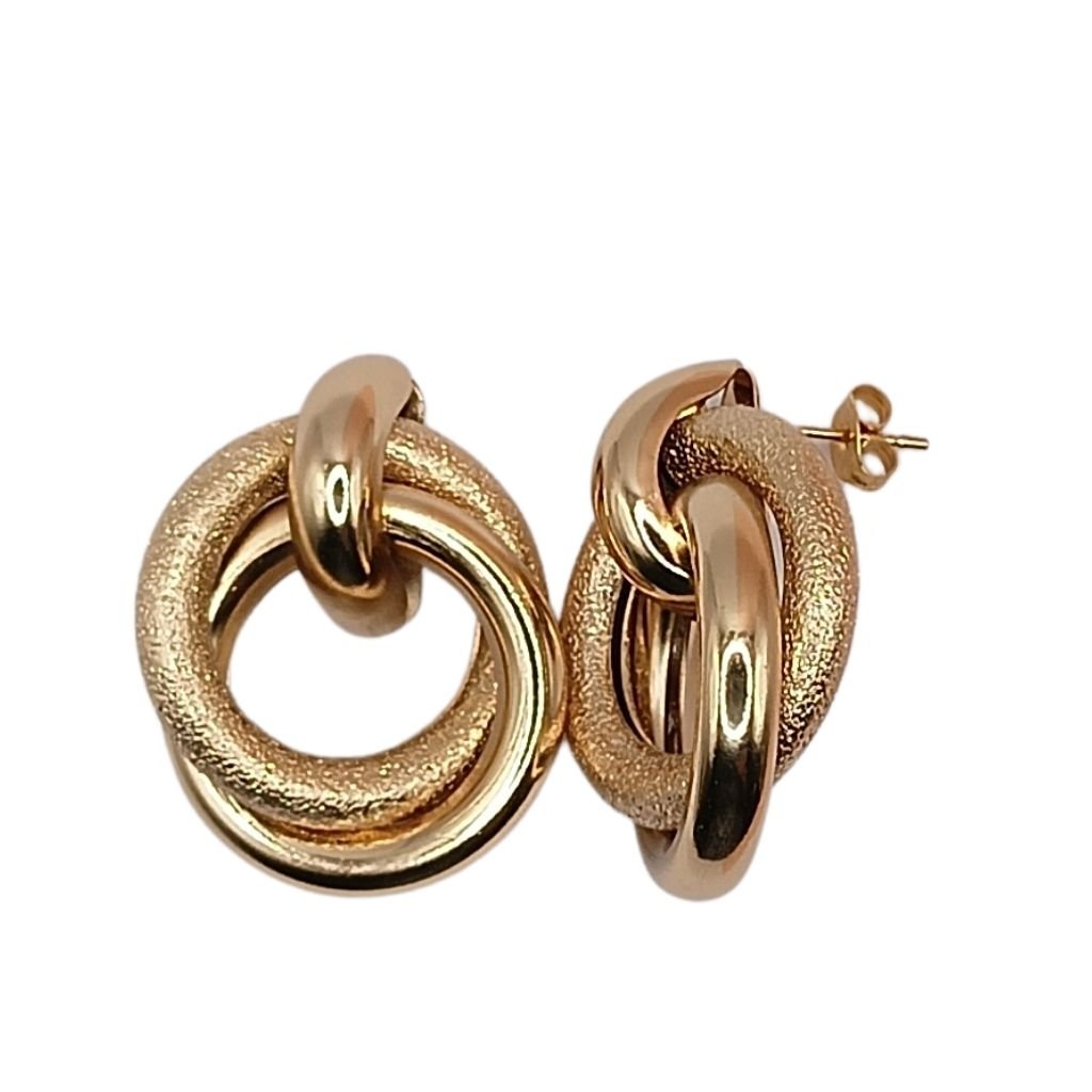 Σκουλαρίκια από ανοξείδωτο ατσάλι σε χρυσή απόχρωση, με μοντέρνο σχέδιο διπλού κρίκου. Ο έξυπνος συνδυασμός γυαλιστερής και ματ υφής προσφέρει κομψότητα και στυλ που ταιριάζει τόσο σε καθημερινές εμφανίσεις όσο και σε πιο ιδιαίτερες περιστάσεις. Ανθεκτικά και ελαφριά για άνετη χρήση.
