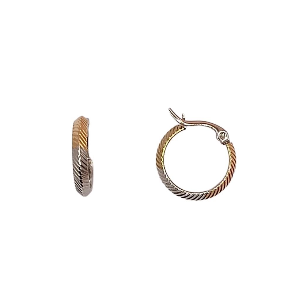 Μικροί κρίκοι από ανοξείδωτο ατσάλι με διάμετρο 1,5 εκ. Το δίχρωμο φινίρισμα σε ασημί και χρυσό μαζί με το διαγώνιο σχέδιο χαρίζει μοντέρνο χαρακτήρα και κομψότητα. Ιδανικά για καθημερινή χρήση, άνετα και ανθεκτικά.