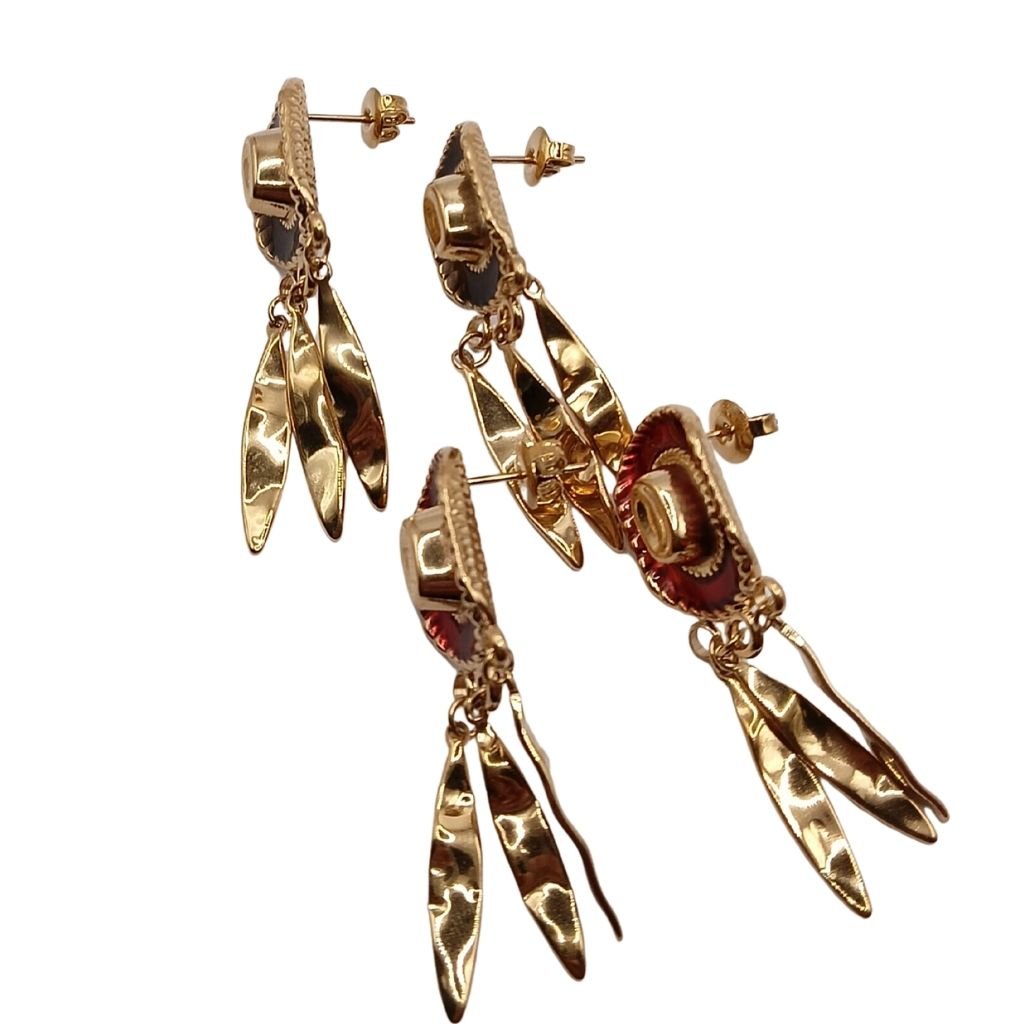 Η βάση είναι οβάλ με ανάγλυφο σχέδιο και σμάλτο σε μαύρο ή κόκκινο χρώμα, ενώ από κάτω κρέμονται τρεις μακριές σφυρήλατες φτερούγες σε χρυσό τόνο.