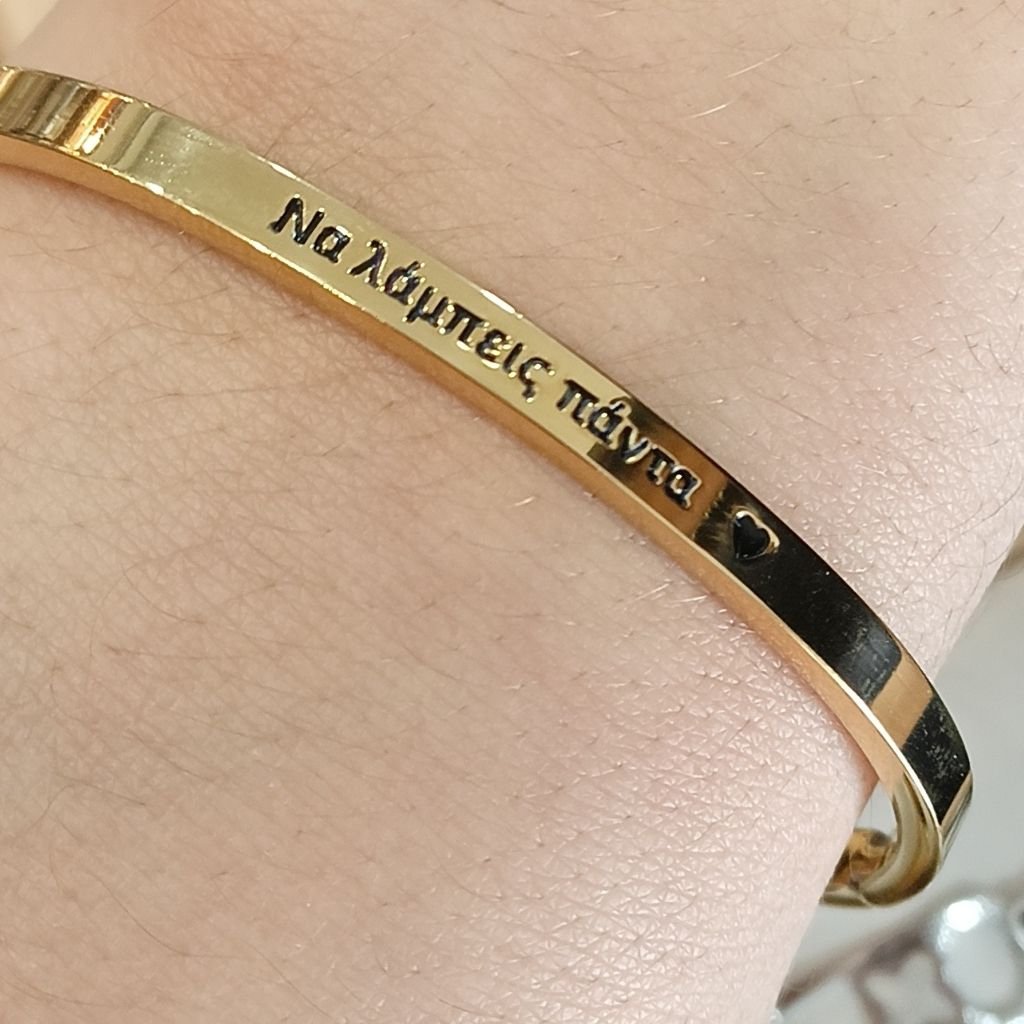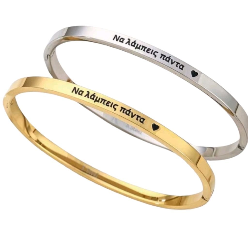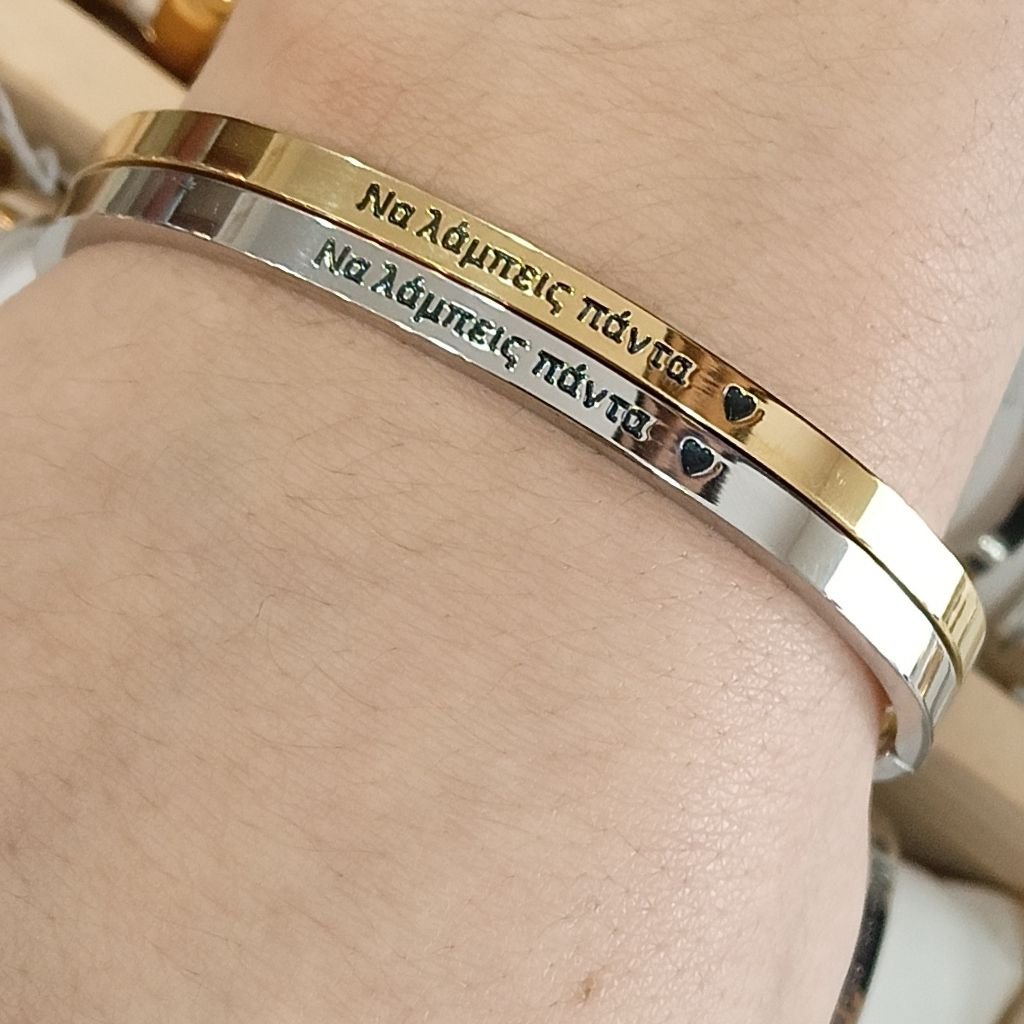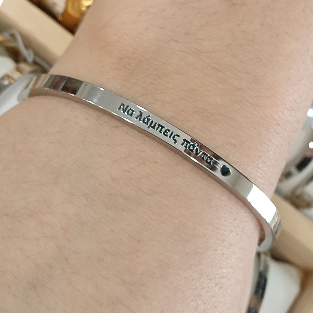 Η χάραξη «Να λάμπεις πάντα» μαζί με τη διακριτική καρδιά προσθέτει ένα θετικό και εμπνευσμένο μήνυμα, κάνοντας το κόσμημα ιδανικό για καθημερινή χρήση αλλά και για ένα ιδιαίτερο δώρο.