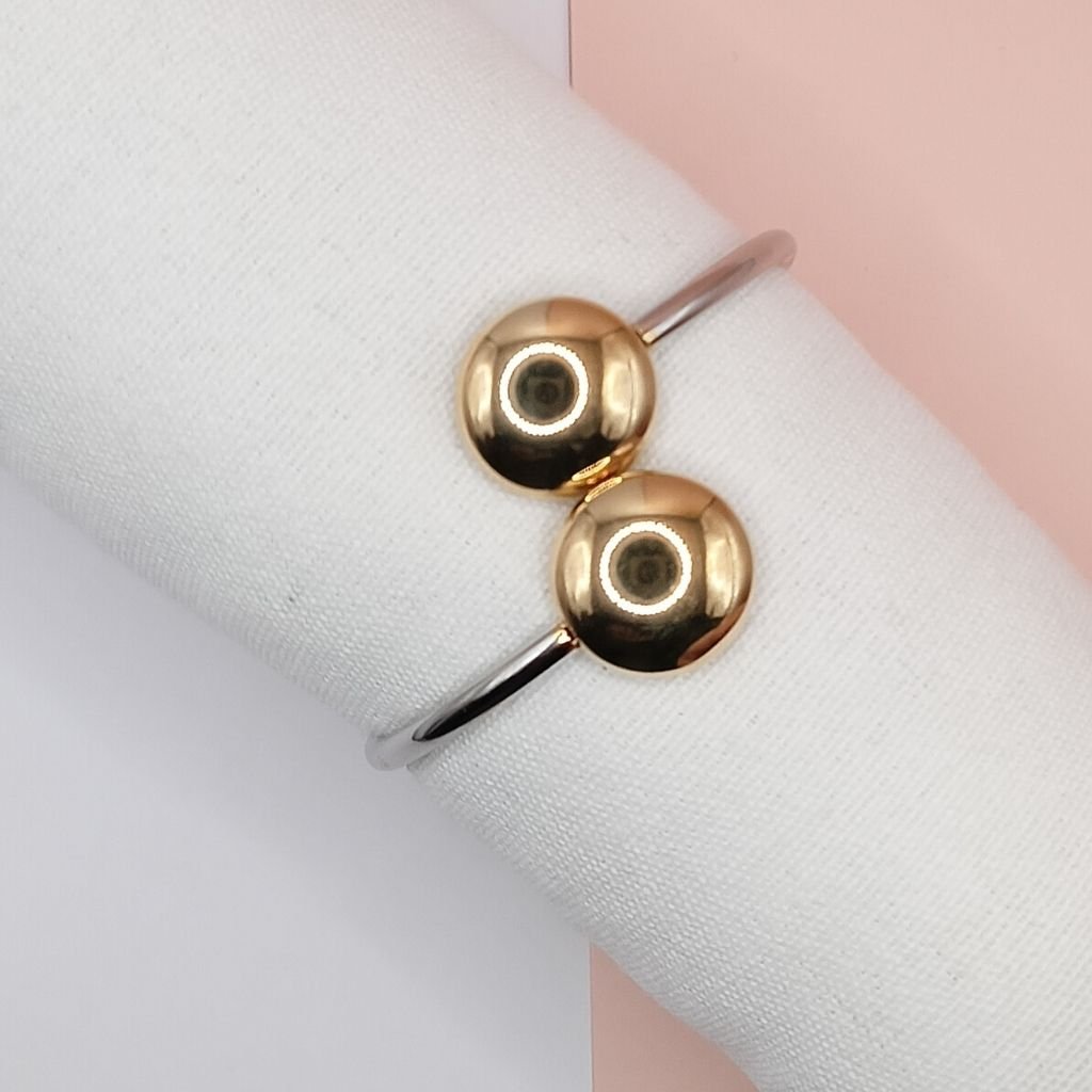 Minimal ανοιχτή χειροπέδα από ανοξείδωτο ατσάλι σε ασημί χρώμα, διακοσμημένη στις άκρες με δύο χρυσές σφαίρες. Μοντέρνα και διακριτική, ταιριάζει απόλυτα σε καθημερινές αλλά και πιο κομψές εμφανίσεις.