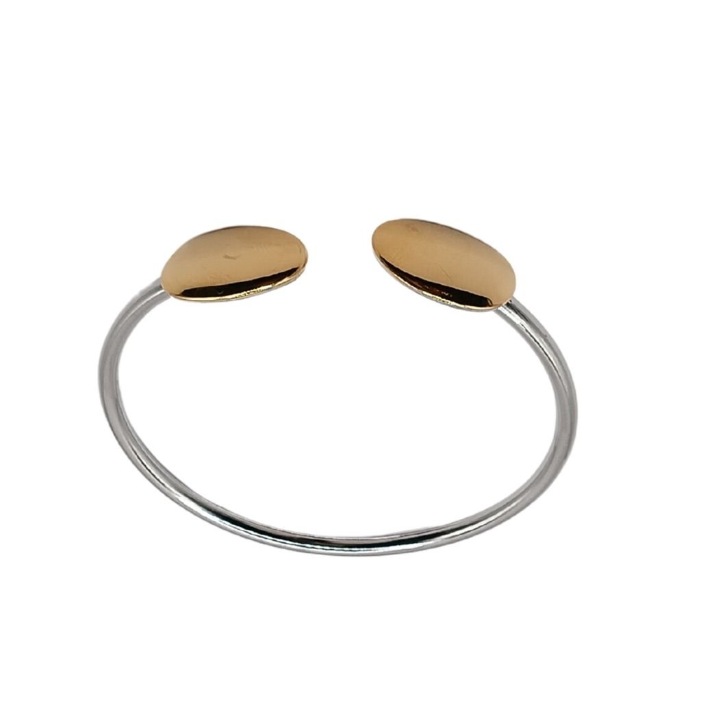 Κλασική και κομψή ανοιχτή χειροπέδα από ανοξείδωτο ατσάλι σε ασημί χρώμα, διακοσμημένη με δύο οβάλ χρυσές άκρες. Ιδανική για καθημερινές εμφανίσεις αλλά και για πιο επίσημο look, φοριέται μόνη της ή συνδυάζεται με άλλα βραχιόλια.