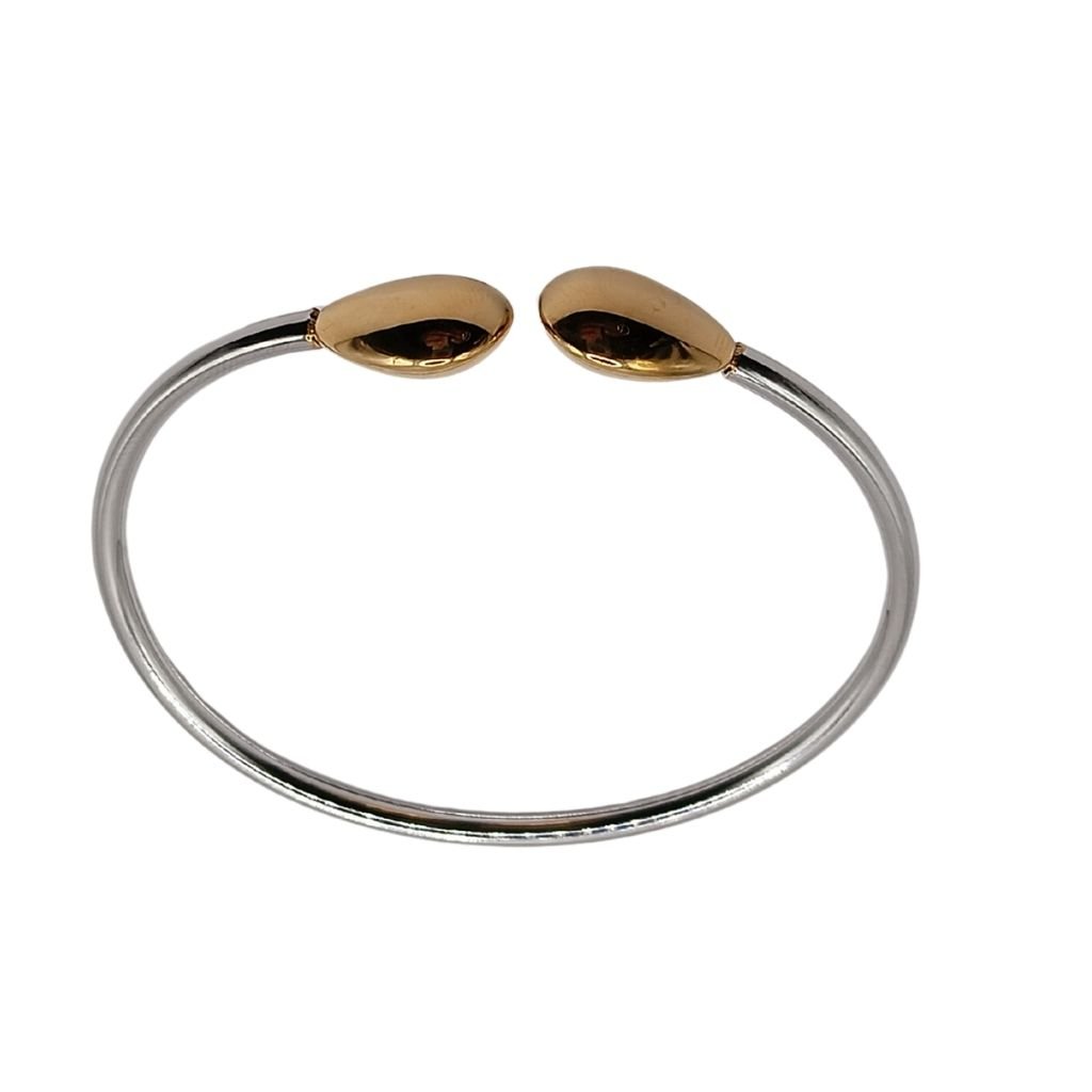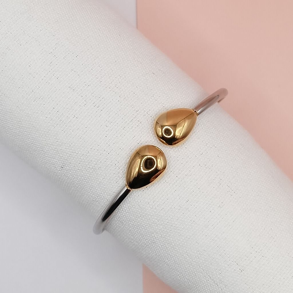 Κομψή και διαχρονική ανοιχτή χειροπέδα από ανοξείδωτο ατσάλι σε ασημί χρώμα, διακοσμημένη με δύο χρυσές σταγόνες στις άκρες. Minimal design που φοριέται εύκολα σε κάθε περίσταση, μόνη της ή σε layering με άλλα βραχιόλια.