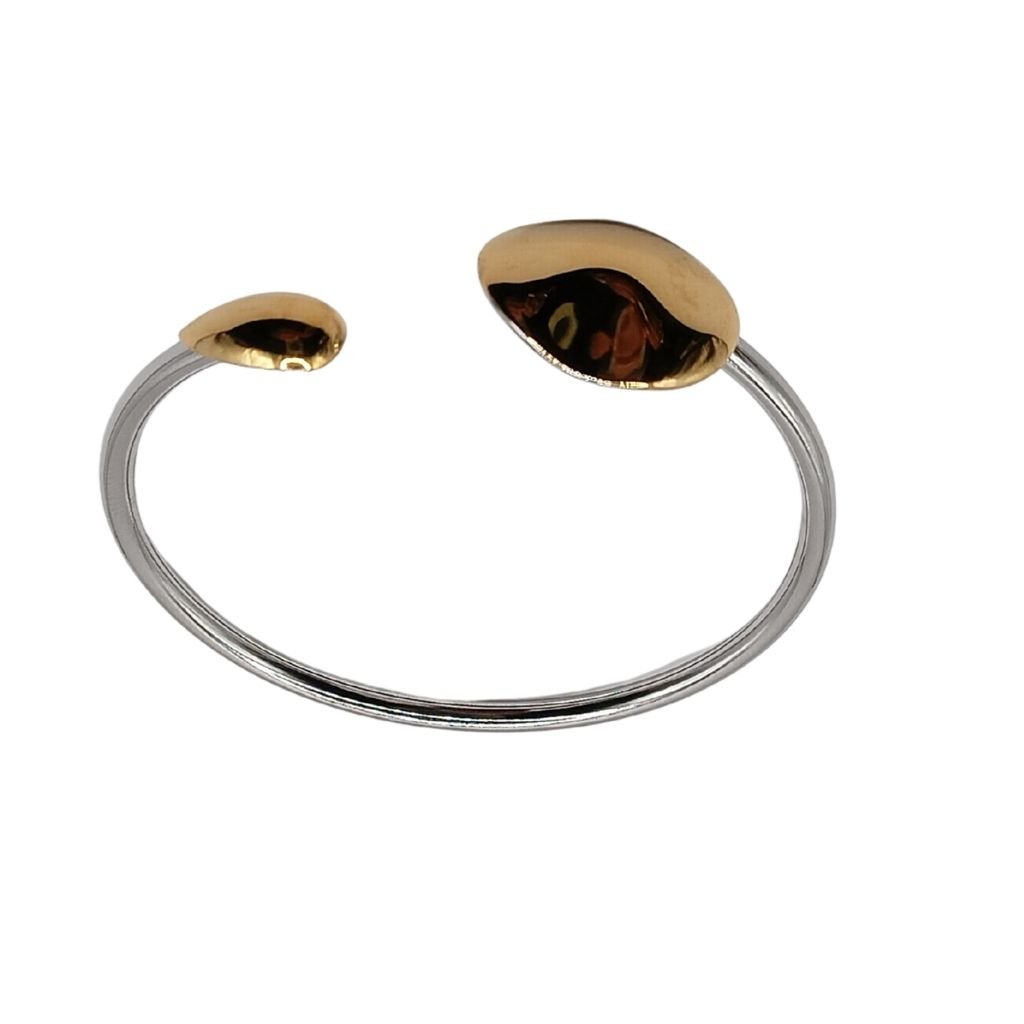 Μοντέρνα ανοιχτή χειροπέδα από ανοξείδωτο ατσάλι σε ασημί χρώμα, διακοσμημένη με δύο ασύμμετρες χρυσές σταγόνες στις άκρες — μία μεγαλύτερη και μία μικρότερη. Minimal αλλά εντυπωσιακή, ιδανική για καθημερινή κομψότητα ή ως διακριτικό δώρο.
