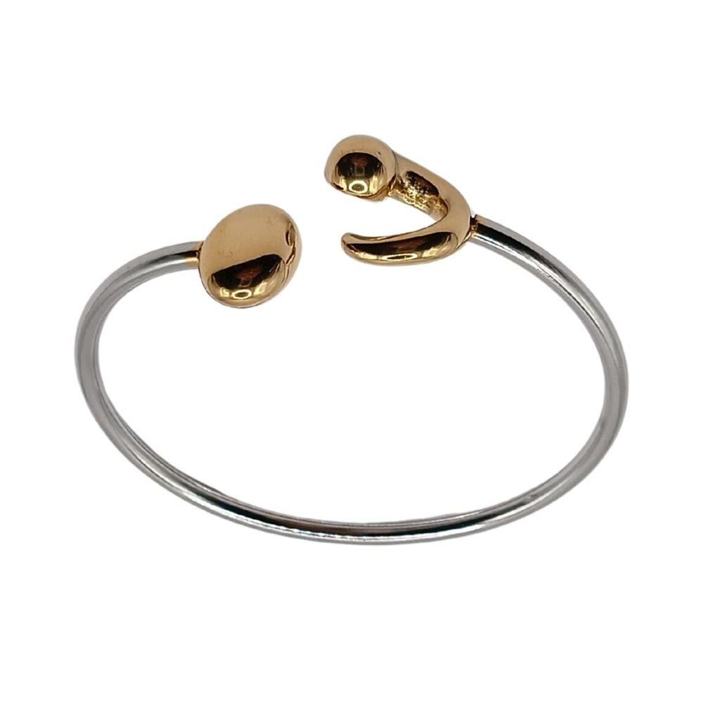 Μοντέρνα ανοιχτή χειροπέδα από ανοξείδωτο ατσάλι σε ασημί χρώμα, με ιδιαίτερο design: χρυσός γάντζος στη μία άκρη και οβάλ χρυσή άκρη στην άλλη. Minimal αλλά ξεχωριστή, ιδανική για να προσθέσει χαρακτήρα σε κάθε look.