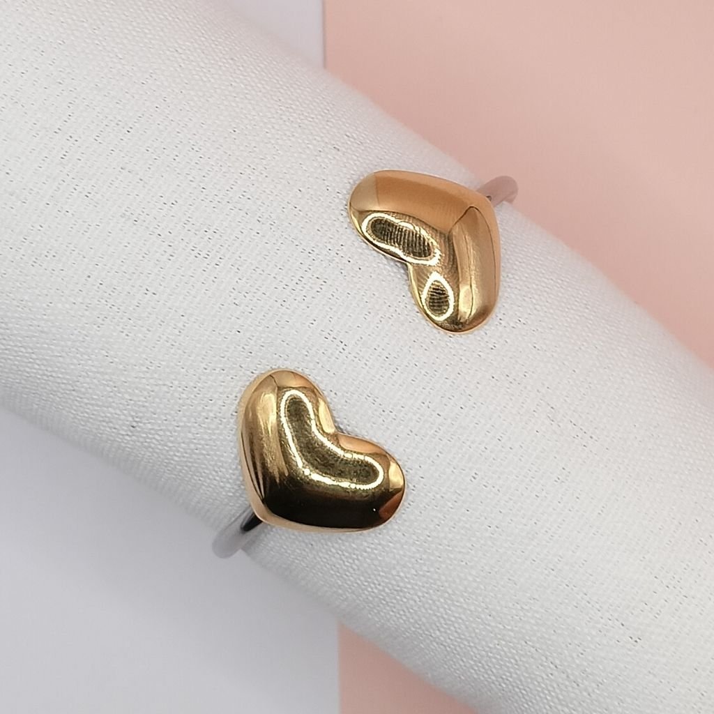 Ρομαντική ανοιχτή χειροπέδα από ανοξείδωτο ατσάλι σε ασημί χρώμα, διακοσμημένη με δύο χρυσές καρδιές στις άκρες. Minimal αλλά γεμάτη κομψότητα, ιδανική για δώρο ή καθημερινή χρήση.
