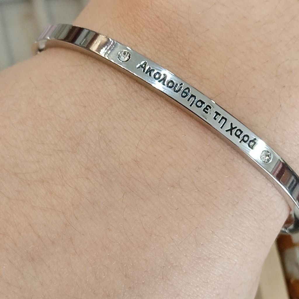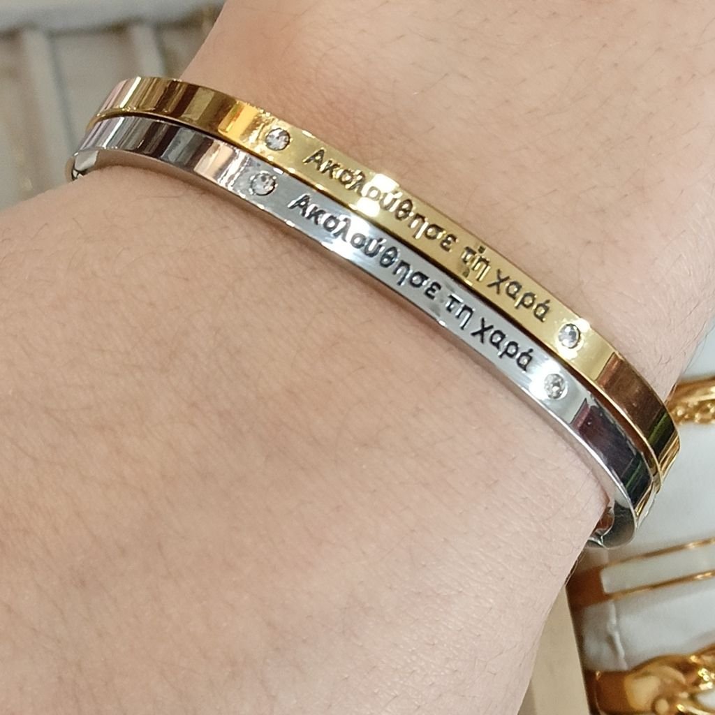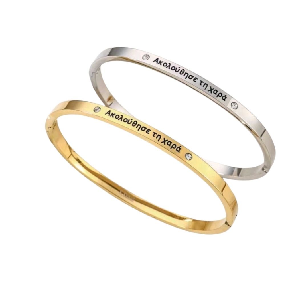 Κομψή ατσάλινη χειροπέδα με χαραγμένο μήνυμα «Ακολούθησε τη χαρά», που αποπνέει θετική ενέργεια και αισιοδοξία. Διακοσμημένη με διακριτικά ζιργκόν που χαρίζουν μια λεπτή, elegant λάμψη.