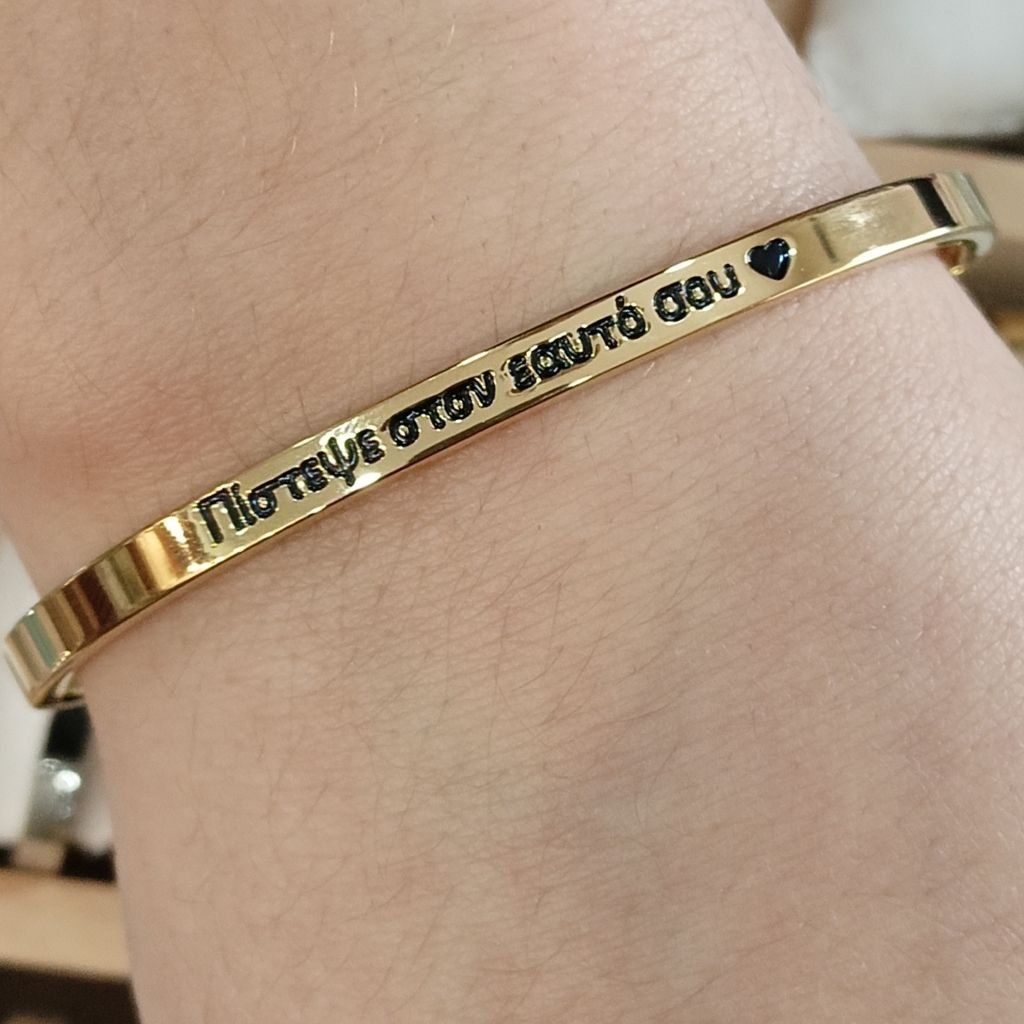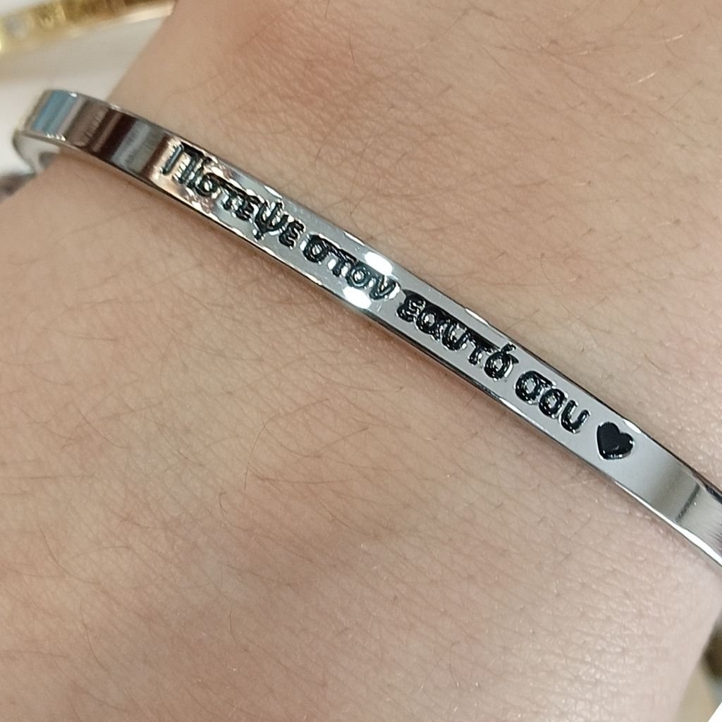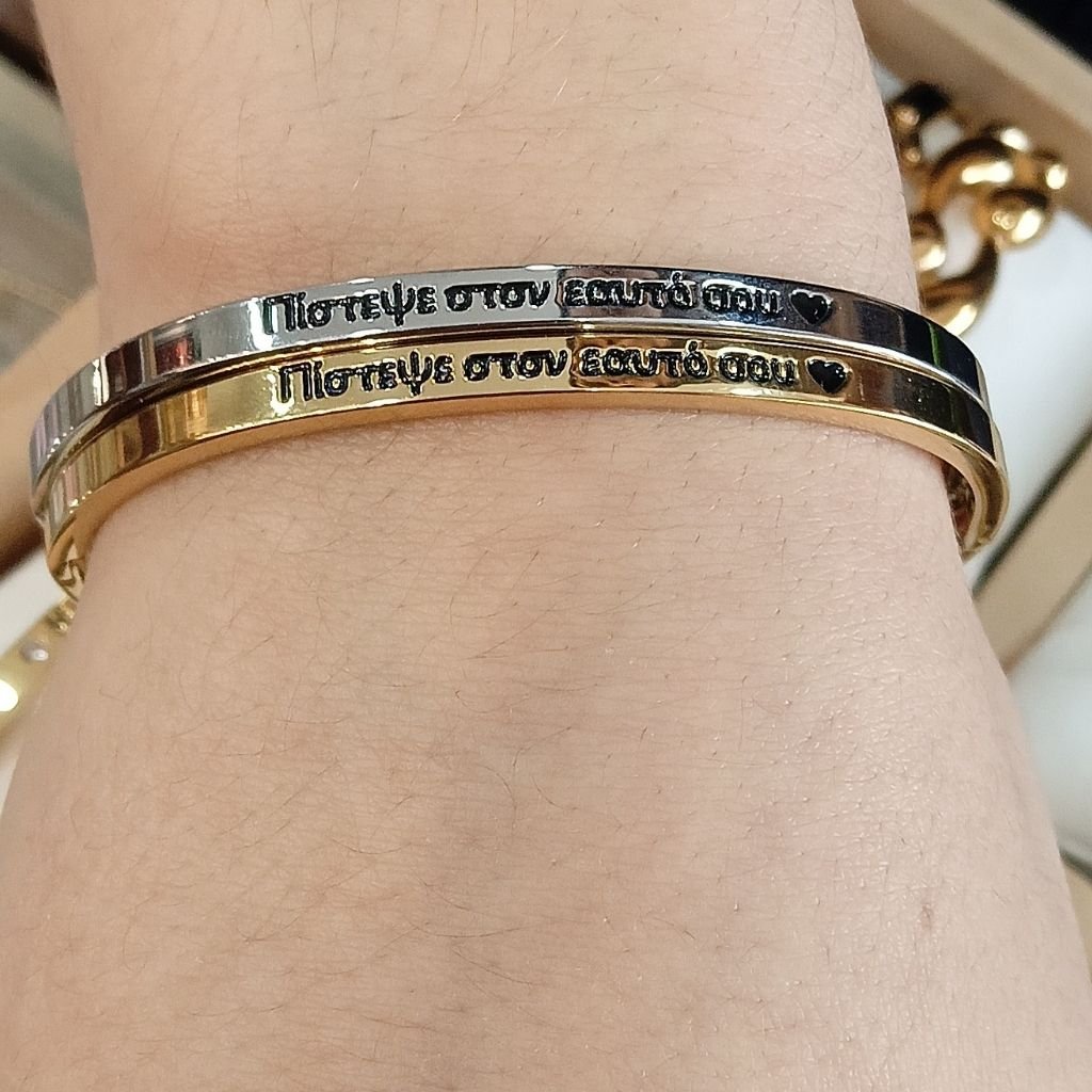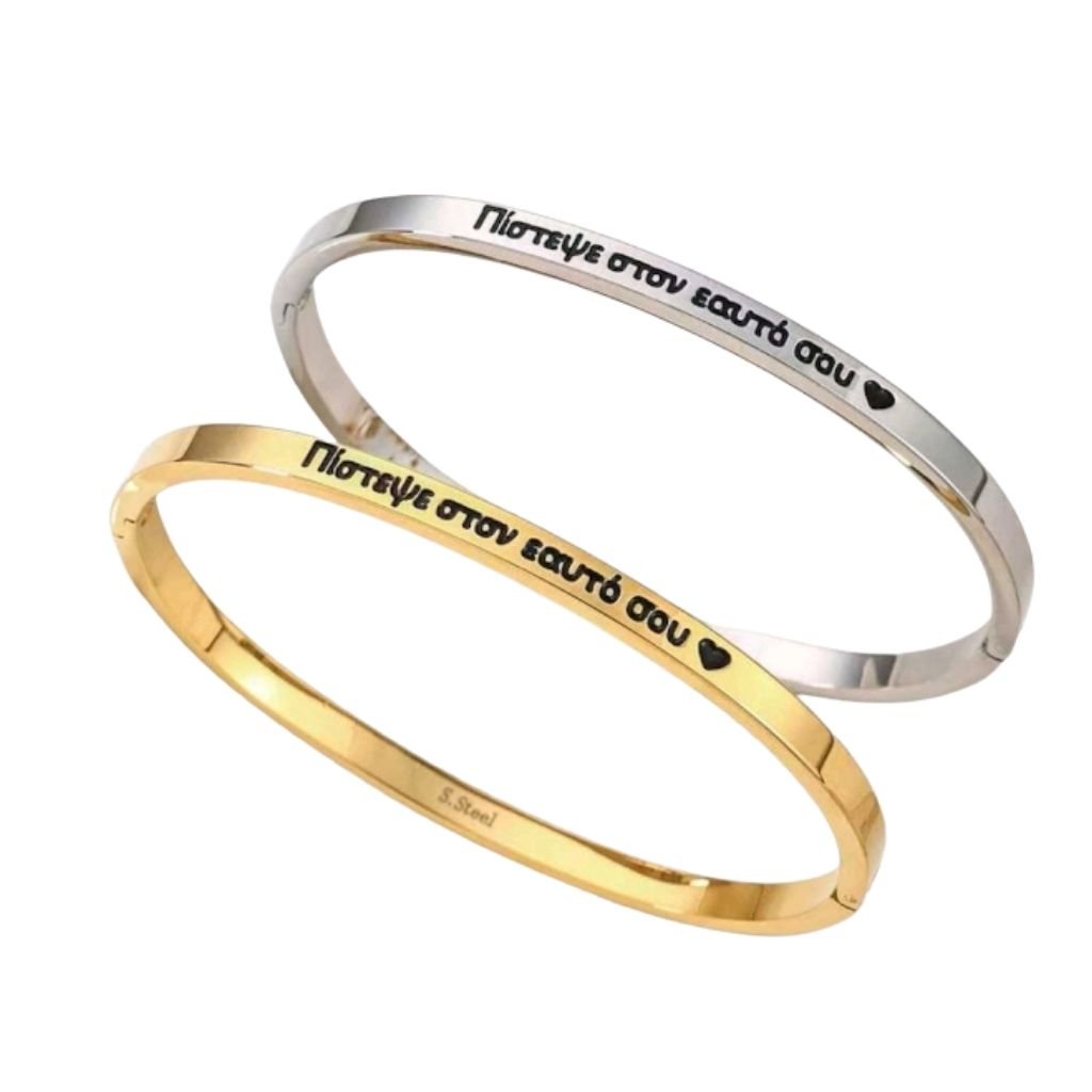 Minimal και διαχρονική ατσάλινη χειροπέδα με χαραγμένο μήνυμα «Πίστεψε στον εαυτό σου», που προσθέτει μια ξεχωριστή, θετική ενέργεια σε κάθε εμφάνιση. Ένα κόσμημα με νόημα, ιδανικό για καθημερινή χρήση αλλά και ως ιδιαίτερο δώρο για αγαπημένα πρόσωπα.