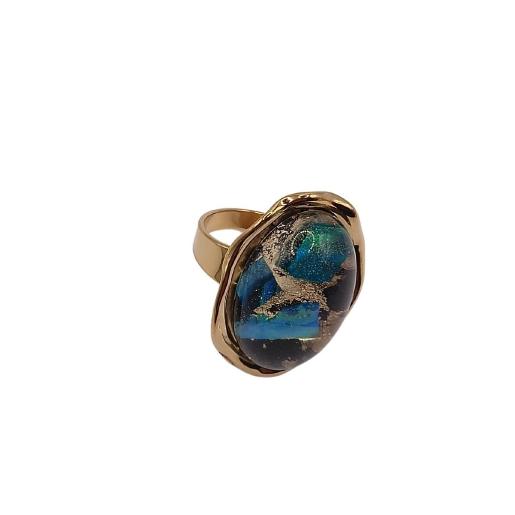 Κομψό δαχτυλίδι από ανοξείδωτο ατσάλι σε χρυσή απόχρωση, με οβάλ γυάλινη πέτρα σε εντυπωσιακά χρώματα (ροζ, κόκκινο, μπλε, μαύρο ιριδίζον).