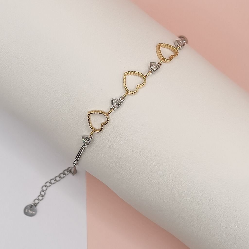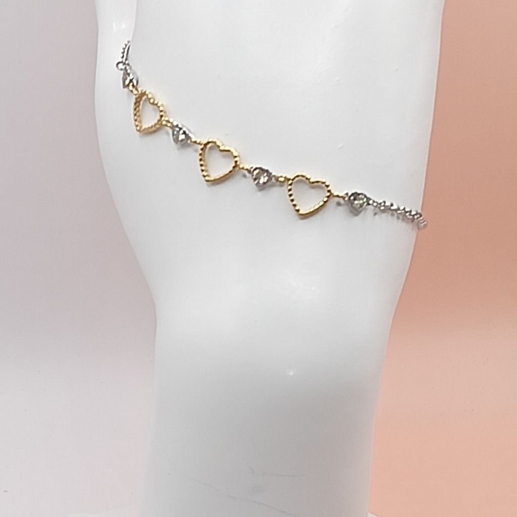 Ρομαντικό βραχιόλι από ανοξείδωτο ατσάλι με εναλλασσόμενες καρδιές σε διχρωμία (ασημί & χρυσό τόνο). Οι μικρές ασημί καρδιές είναι διακοσμημένες με λαμπερά ζιργκόν, ενώ οι μεγαλύτερες χρυσές καρδιές έχουν ανάγλυφο σχέδιο σχοινί.