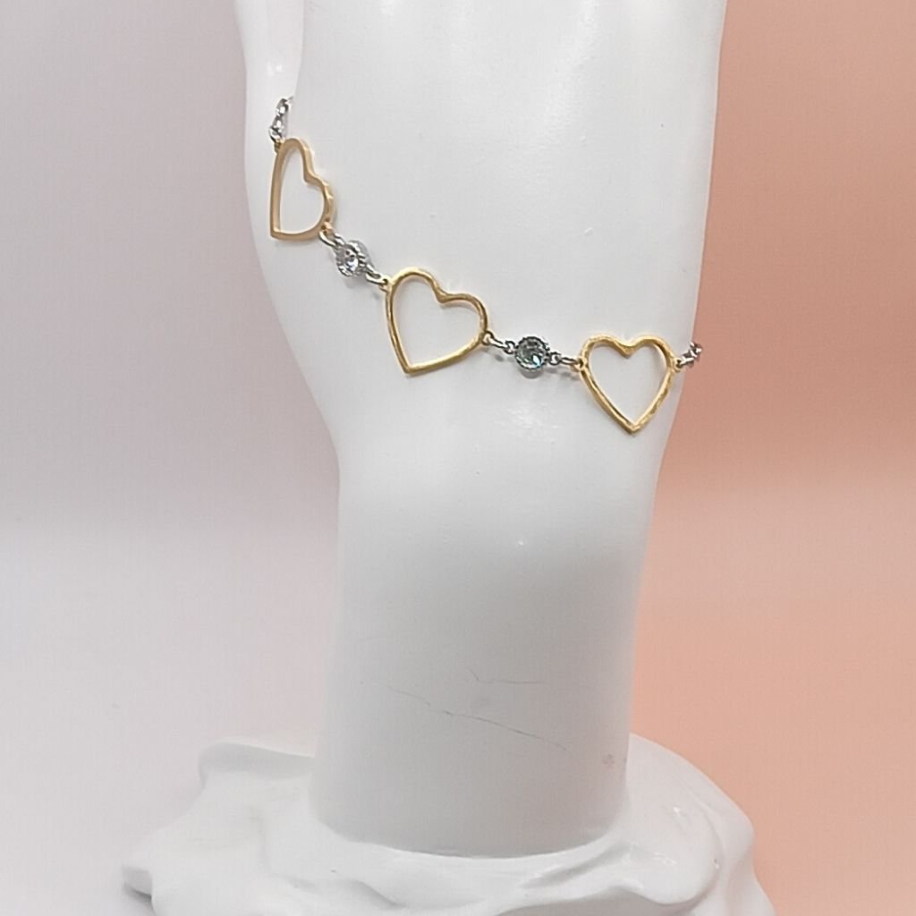 Διαθέτει τρεις ανοιχτές καρδιές σε χρυσό τόνο και ενδιάμεσα λαμπερά λευκά ζιργκόν, προσφέροντας διακριτική λάμψη και θηλυκή κομψότητα.