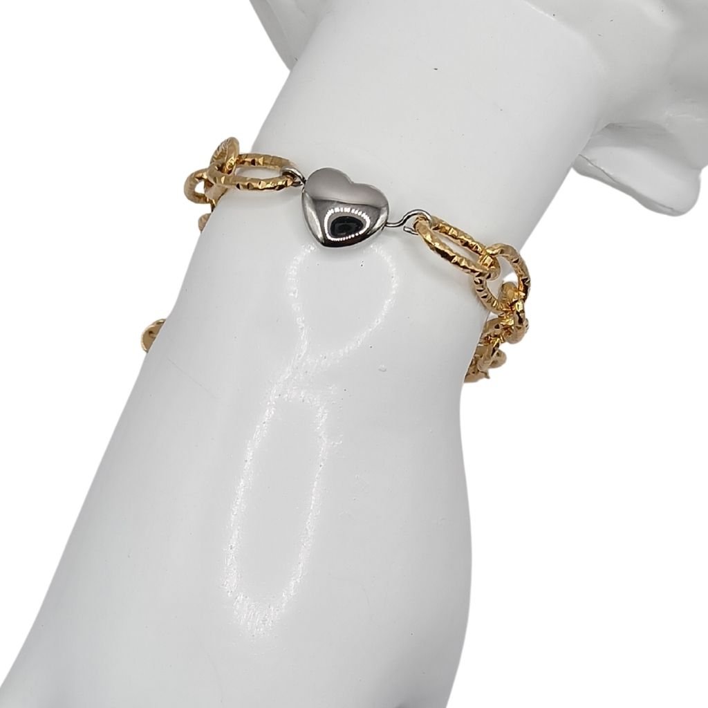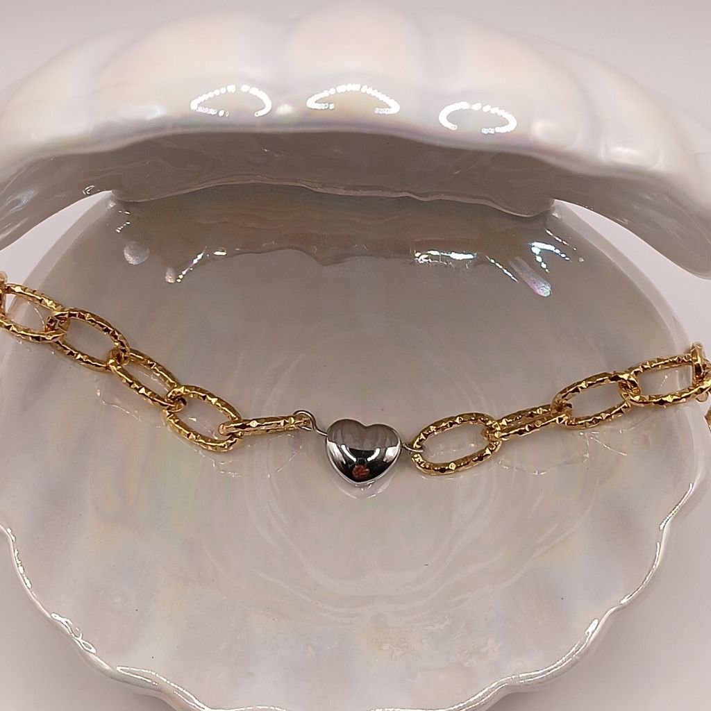 Κομψό βραχιόλι από ανοξείδωτο ατσάλι με ανάγλυφους χρυσούς κρίκους και κεντρικό στοιχείο ασημί καρδιά. Ρομαντικό και στιλάτο, ιδανικό για κάθε μέρα ή ως δώρο με νόημα.