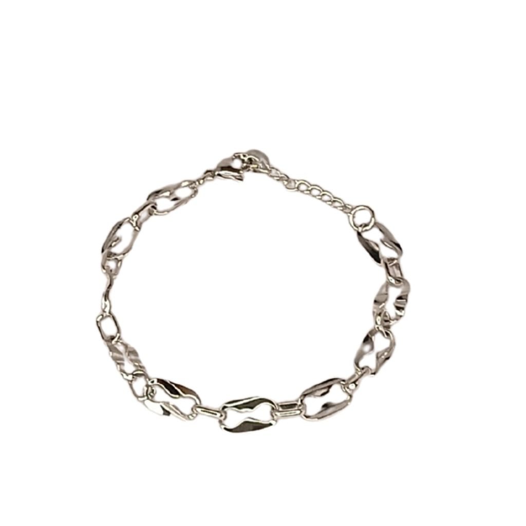 Στυλάτο βραχιόλι από ανοξείδωτο ατσάλι σε ασημί χρώμα, με ιδιαίτερη πλέξη από καμπύλους κρίκους. Ένα μοντέρνο σχέδιο που χαρίζει λάμψη και προσωπικότητα σε κάθε εμφάνιση. Μπορεί να φορεθεί μόνο του ή σε συνδυασμό με άλλα βραχιόλια και ρολόγια για πιο statement look.