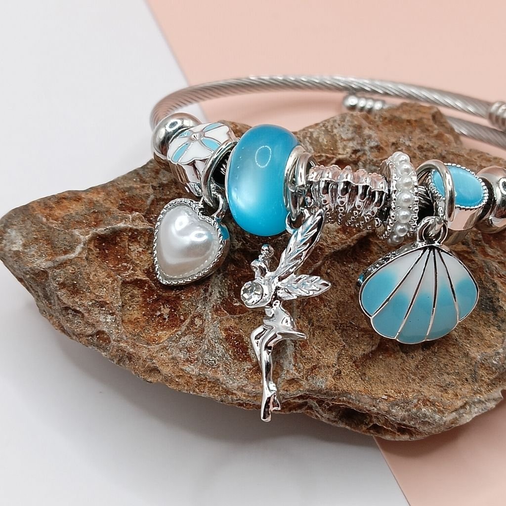 Στυλάτο ατσάλινο βραχιόλι διακοσμημένο με μοναδικά charms σε μπλε και ασημί αποχρώσεις. Περιλαμβάνει διακοσμητικές λεπτομέρειες όπως λουλούδι, μαργαριτάρι, κοχύλι και γοητευτική νεραϊδούλα που χαρίζουν παιχνιδιάρικη και ρομαντική διάθεση. Ιδανικό για καλοκαιρινές εμφανίσεις αλλά και για δώρο σε αγαπημένα πρόσωπα.