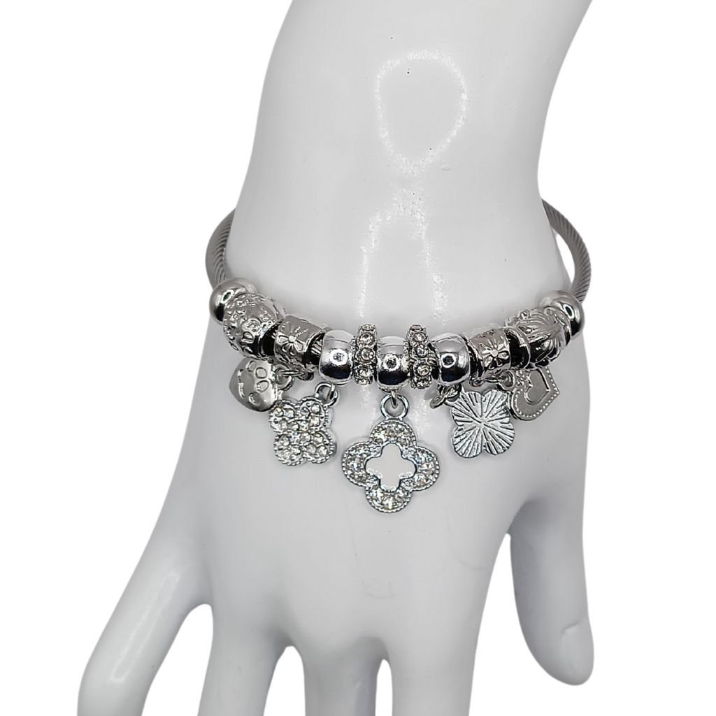Κομψό και λαμπερό βραχιόλι από ανοξείδωτο ατσάλι σε ασημί χρώμα, με πλούσια διακόσμηση από charms τύπου Pandora. Κρεμαστά μοτίφ με ζιργκόν, τετράφυλλα και καρδούλες δημιουργούν ένα εντυπωσιακό αποτέλεσμα που συμπληρώνει κάθε εμφάνιση.