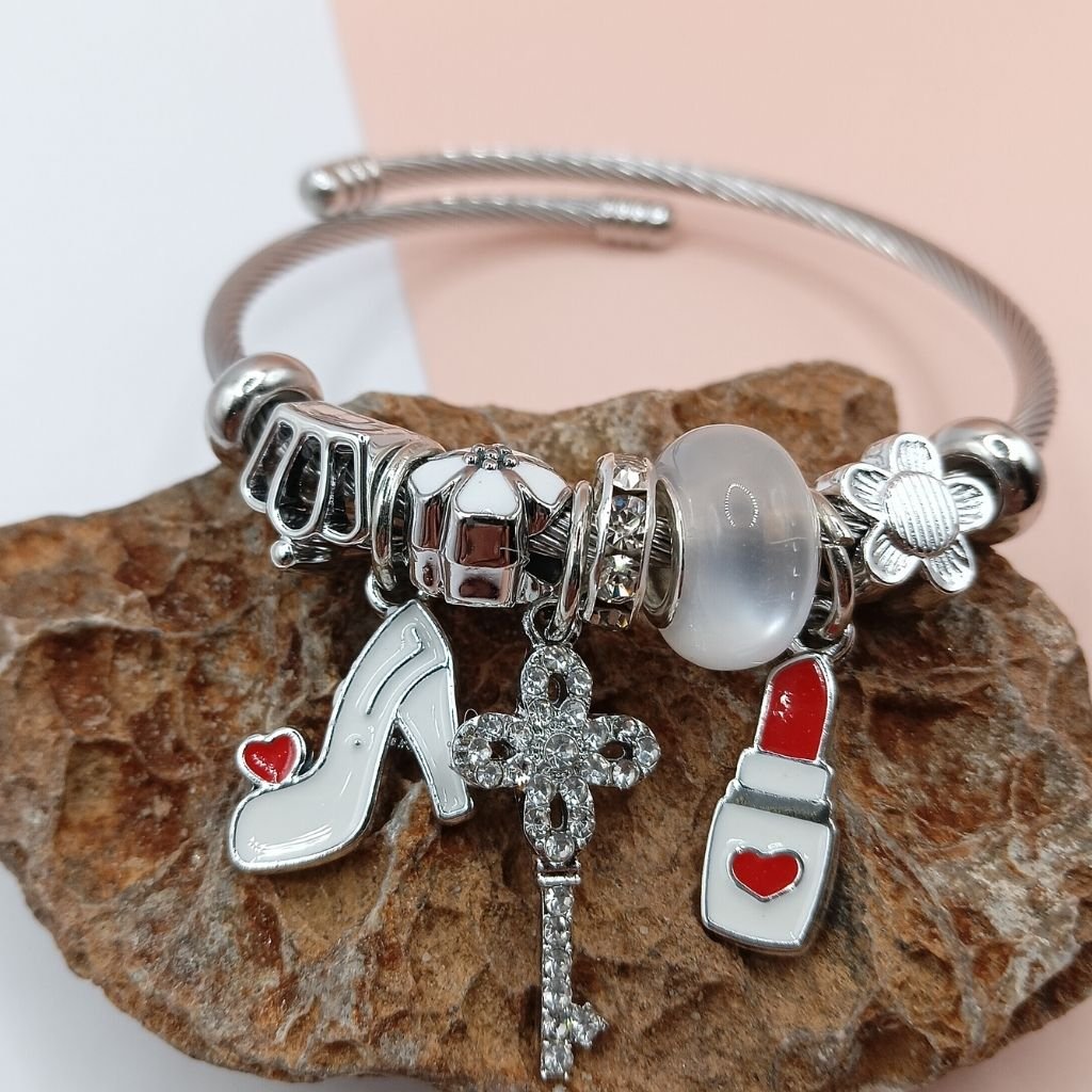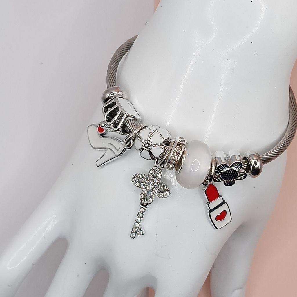 Στυλάτο ατσάλινο βραχιόλι με εντυπωσιακά ασημί charms, που περιλαμβάνουν ένα γοβάκι με κόκκινη καρδιά, αστραφτερό κλειδί διακοσμημένο με στρας, λουλούδι και charm κραγιόν με κόκκινες λεπτομέρειες. Ένα girly κόσμημα που δίνει μοντέρνο και παιχνιδιάρικο ύφος σε κάθε look.