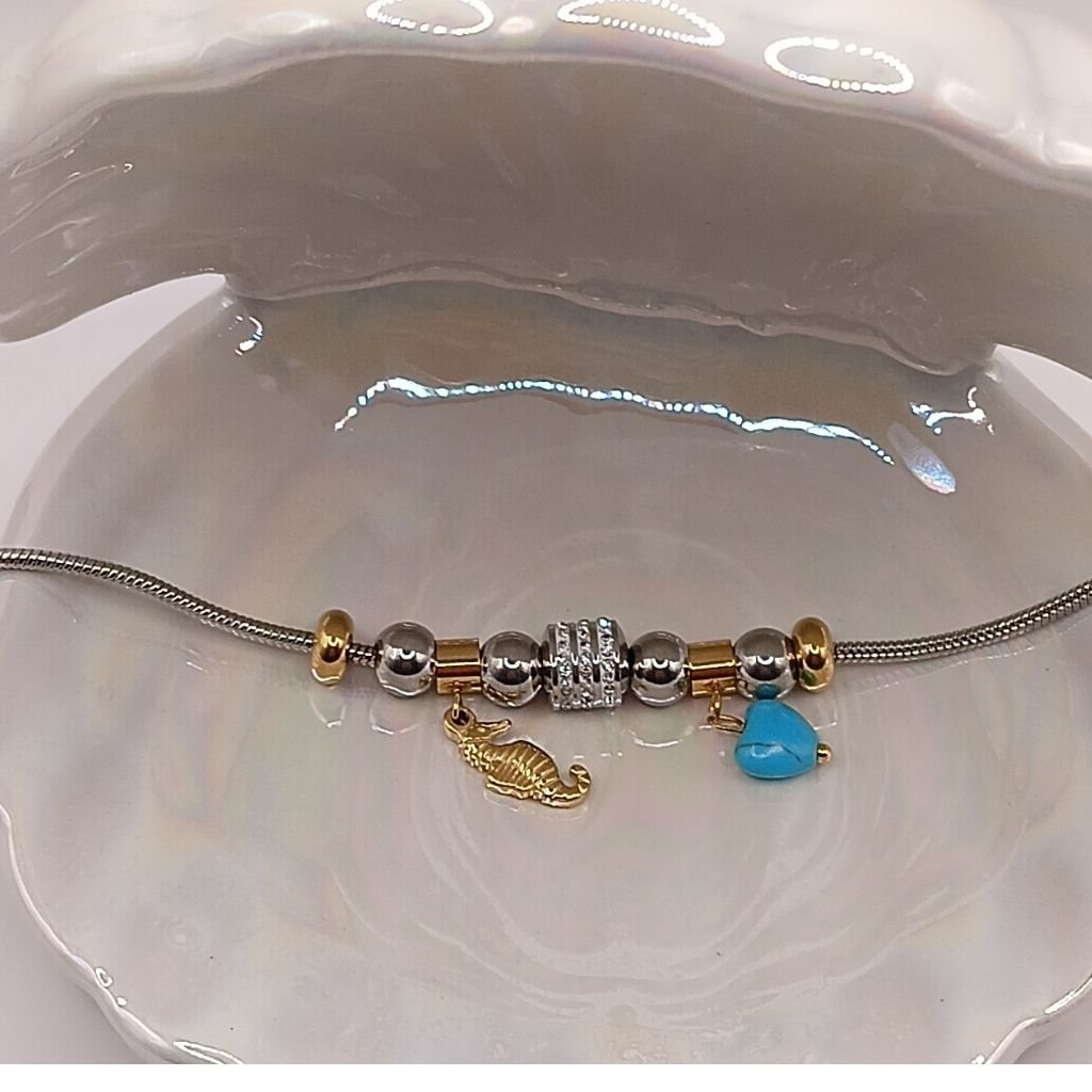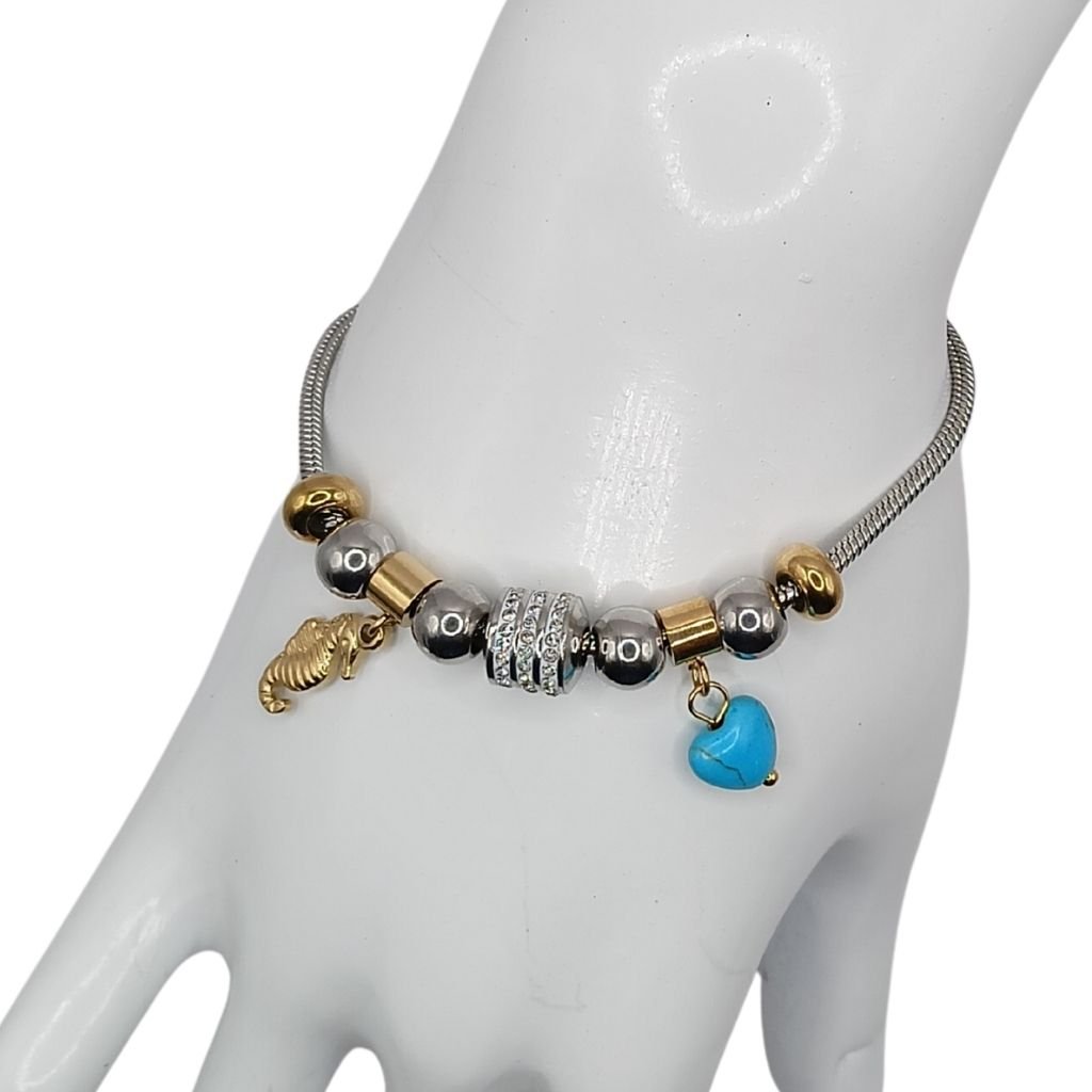 Πρωτότυπο ατσάλινο βραχιόλι με χάντρες σε χρυσό και ασημί, διακοσμημένο με χρυσό ιππόκαμπο και μπλε καρδούλα. Κεντρική χάντρα με λαμπερά ζιργκόν δίνει επιπλέον κομψότητα. Ιδανικό για καλοκαιρινές εμφανίσεις και δώρο με συμβολισμό.