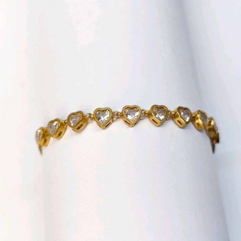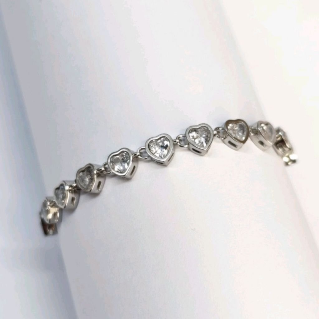 Ρομαντικό και λαμπερό ατσάλινο βραχιόλι ριβιέρα με καρδιές, διακοσμημένες με λαμπερά λευκά ζιργκόν που χαρίζουν μοναδική λάμψη σε κάθε σου κίνηση. Ένα κομψό κόσμημα που αποπνέει θηλυκότητα και ταιριάζει ιδανικά τόσο για καθημερινές όσο και για πιο ιδιαίτερες εμφανίσεις.