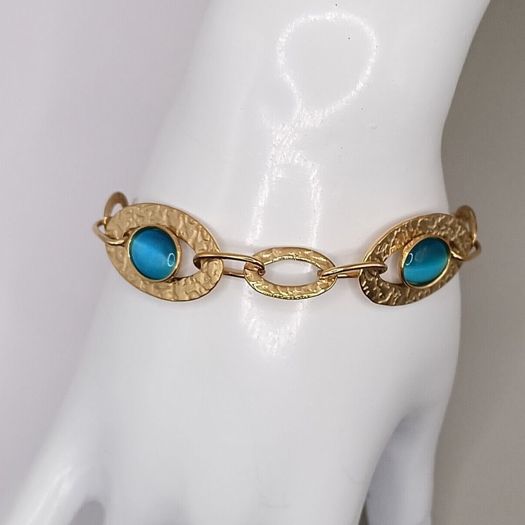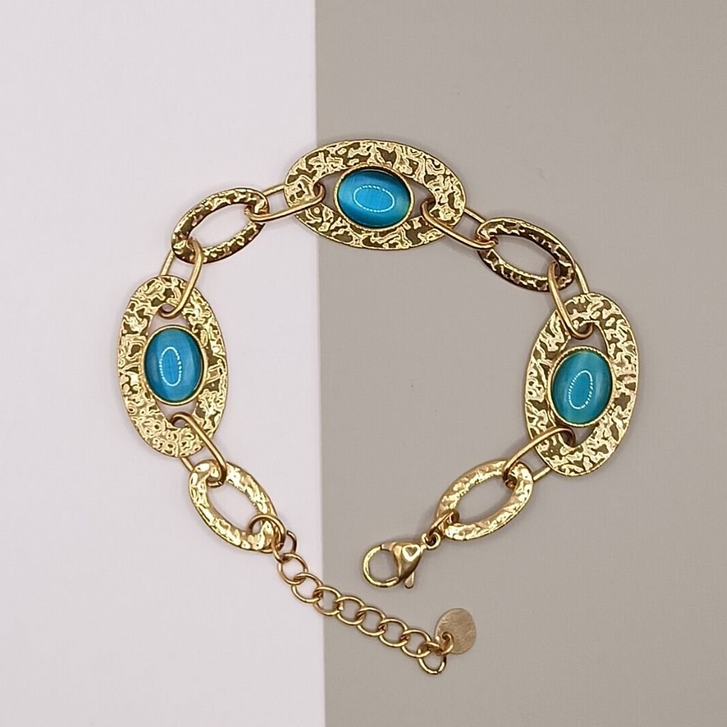 Κομψό βραχιόλι από ανοξείδωτο ατσάλι σε χρυσό χρώμα, με οβάλ μοτίβα και γαλάζιες πέτρες στο κέντρο. Ένα εντυπωσιακό αξεσουάρ που συνδυάζει κομψότητα και καλοκαιρινή διάθεση. Ιδανικό για να ολοκληρώσει κάθε εμφάνιση, από το πρωί έως το βράδυ.