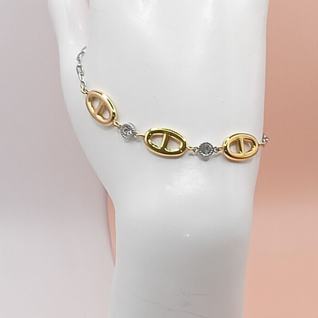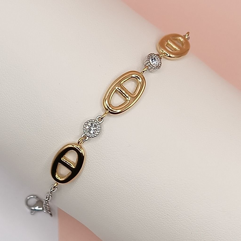 Μοντέρνο βραχιόλι από ανοξείδωτο ατσάλι σε χρυσό τόνο με κομψούς οβάλ κρίκους τύπου “link” και ενδιάμεσα λαμπερά λευκά ζιργκόν σε ασημί πλαίσιο.