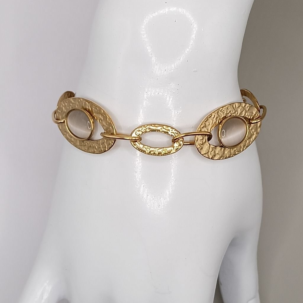 Κομψό βραχιόλι από ανοξείδωτο ατσάλι σε χρυσό χρώμα, με οβάλ μοτίβα και μπεζ πέτρες στο κέντρο. Διαχρονικό και στυλάτο, ταιριάζει σε κάθε περίσταση και μπορεί να φορεθεί μόνο του ή σε συνδυασμό με άλλα βραχιόλια.