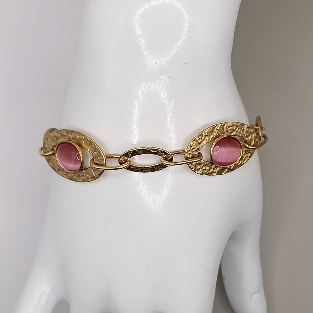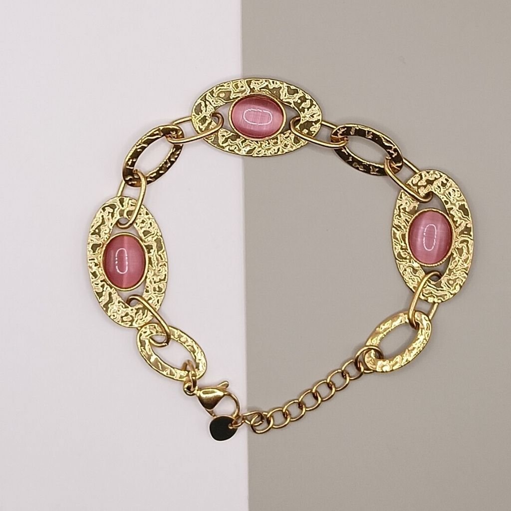 Κομψό βραχιόλι από ανοξείδωτο ατσάλι σε χρυσό χρώμα, με εντυπωσιακά οβάλ μοτίβα και ροζ πέτρες στο κέντρο. Ρομαντικό και στυλάτο, προσθέτει θηλυκότητα και χρώμα σε κάθε εμφάνιση.