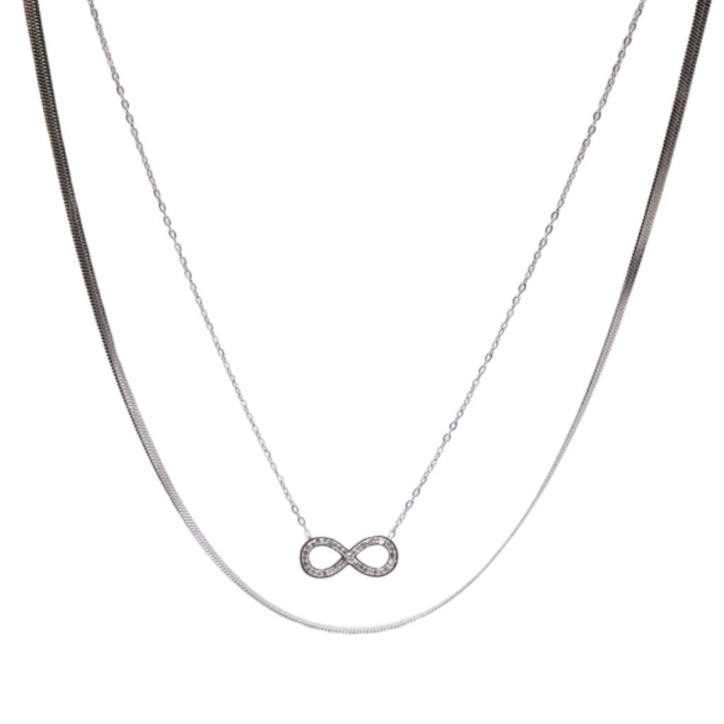 Κομψό διπλό κολιέ από ανοξείδωτο ατσάλι σε ασημί χρώμα. Το λεπτότερο επίπεδο στολίζεται με το διαχρονικό σύμβολο του απείρου, διακοσμημένο με λαμπερά λευκά ζιργκόν, που συμβολίζει αιώνια αγάπη και δύναμη. Ιδανικό για ρομαντικό αλλά και μοντέρνο στυλ.