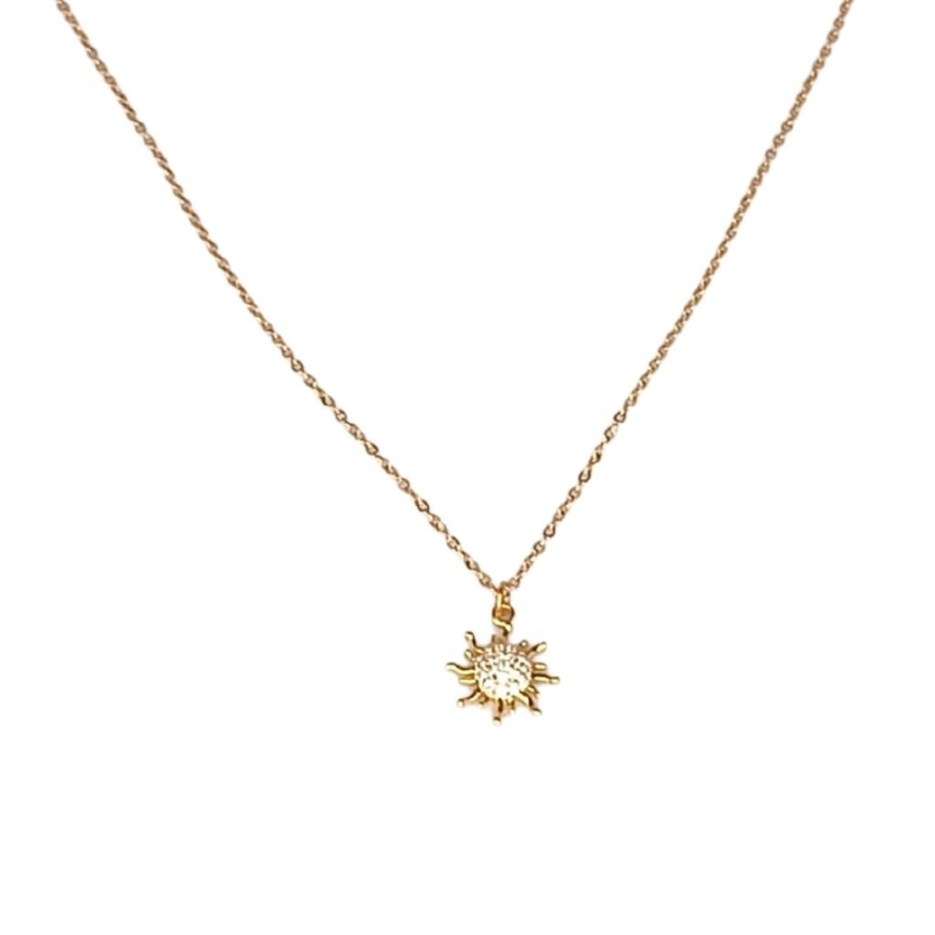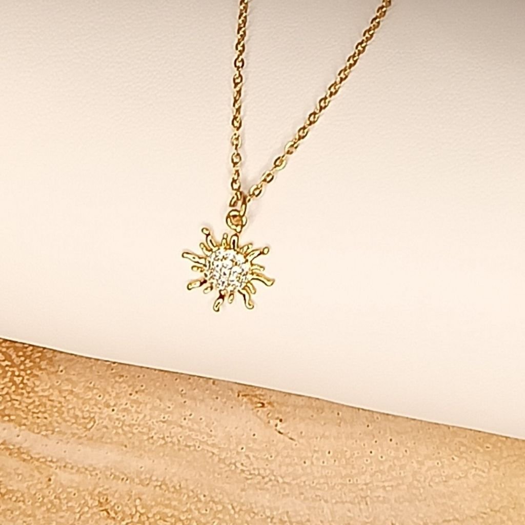 Λαμπερό και κομψό κολιέ από ανοξείδωτο ατσάλι με μοτίφ σε σχήμα ήλιου. Το κεντρικό στοιχείο είναι διακοσμημένο με ζιργκόν που χαρίζουν εκθαμβωτική λάμψη, ιδανικό για να φωτίσει κάθε σας εμφάνιση. Το επιχρυσωμένο φινίρισμα δίνει πολυτελή όψη ενώ παραμένει ανθεκτικό στη χρήση.