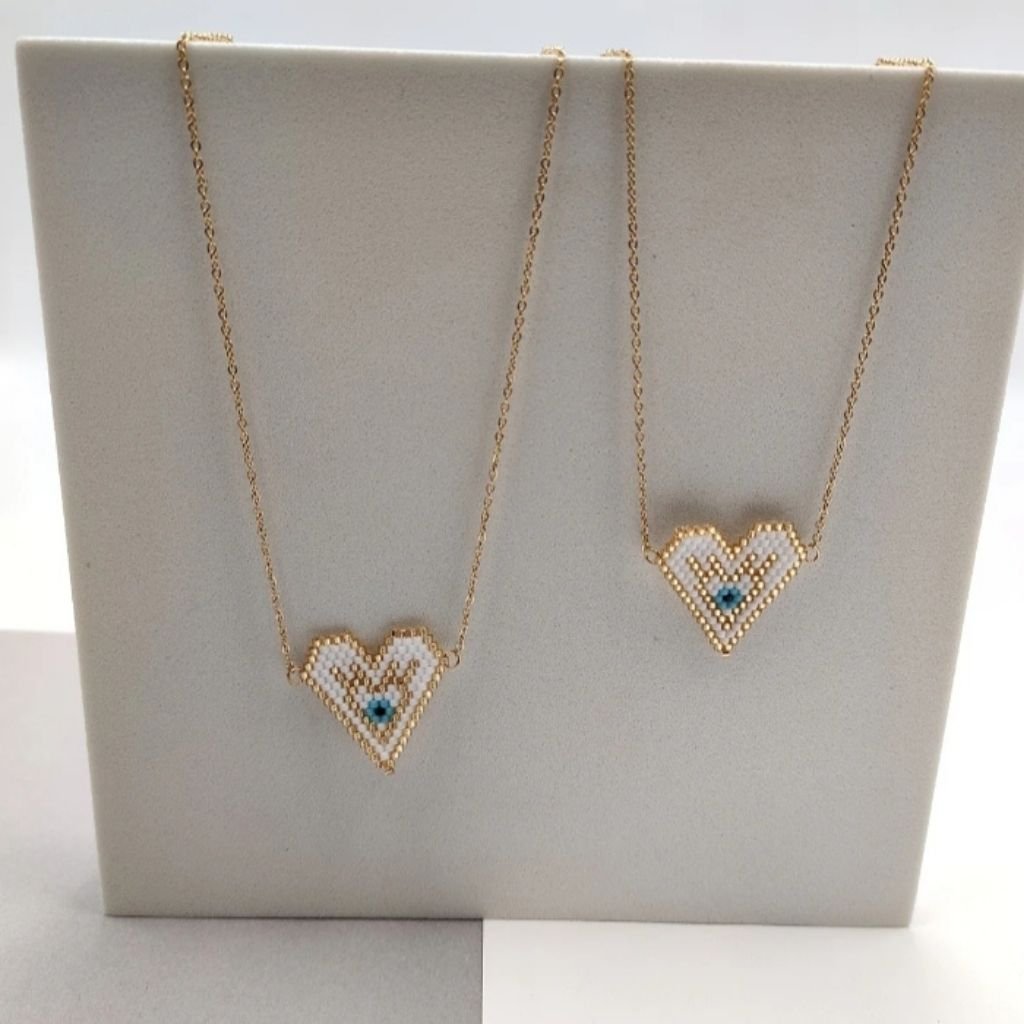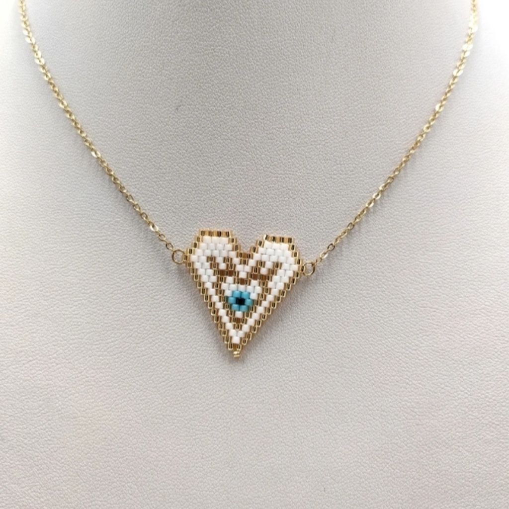 Ένα ιδιαίτερο κολιέ σε σχήμα καρδιάς, κεντημένο στο χέρι με αυθεντικές χάντρες Miyuki, και σχέδιο ματιού στο κέντρο – για προστασία, αγάπη και στιλ σε μία μόνο πινελιά!