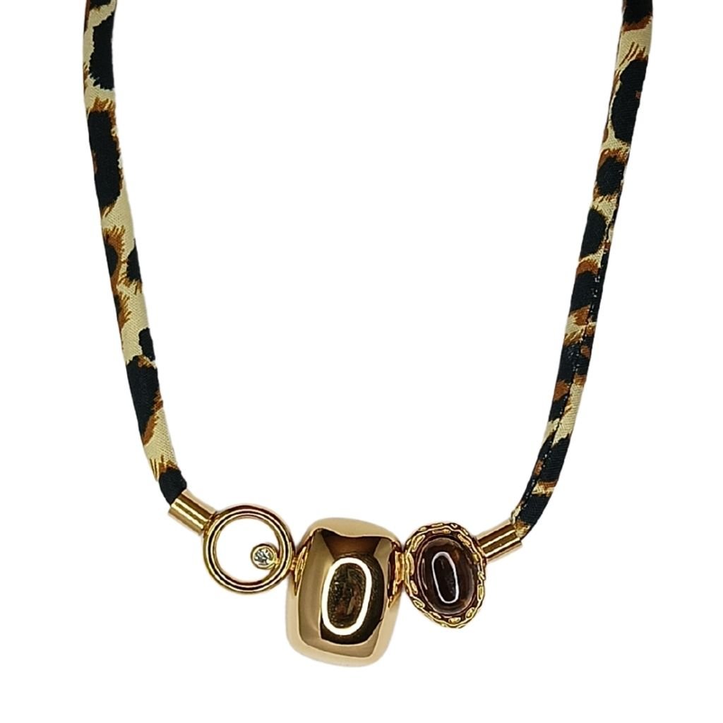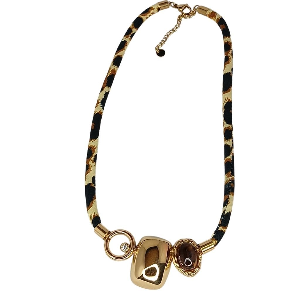 Μοντέρνο κολιέ από ανοξείδωτο ατσάλι με υφασμάτινη λεοπάρ κορδέλα και εντυπωσιακά μεταλλικά στοιχεία σε χρυσή απόχρωση στο κέντρο.