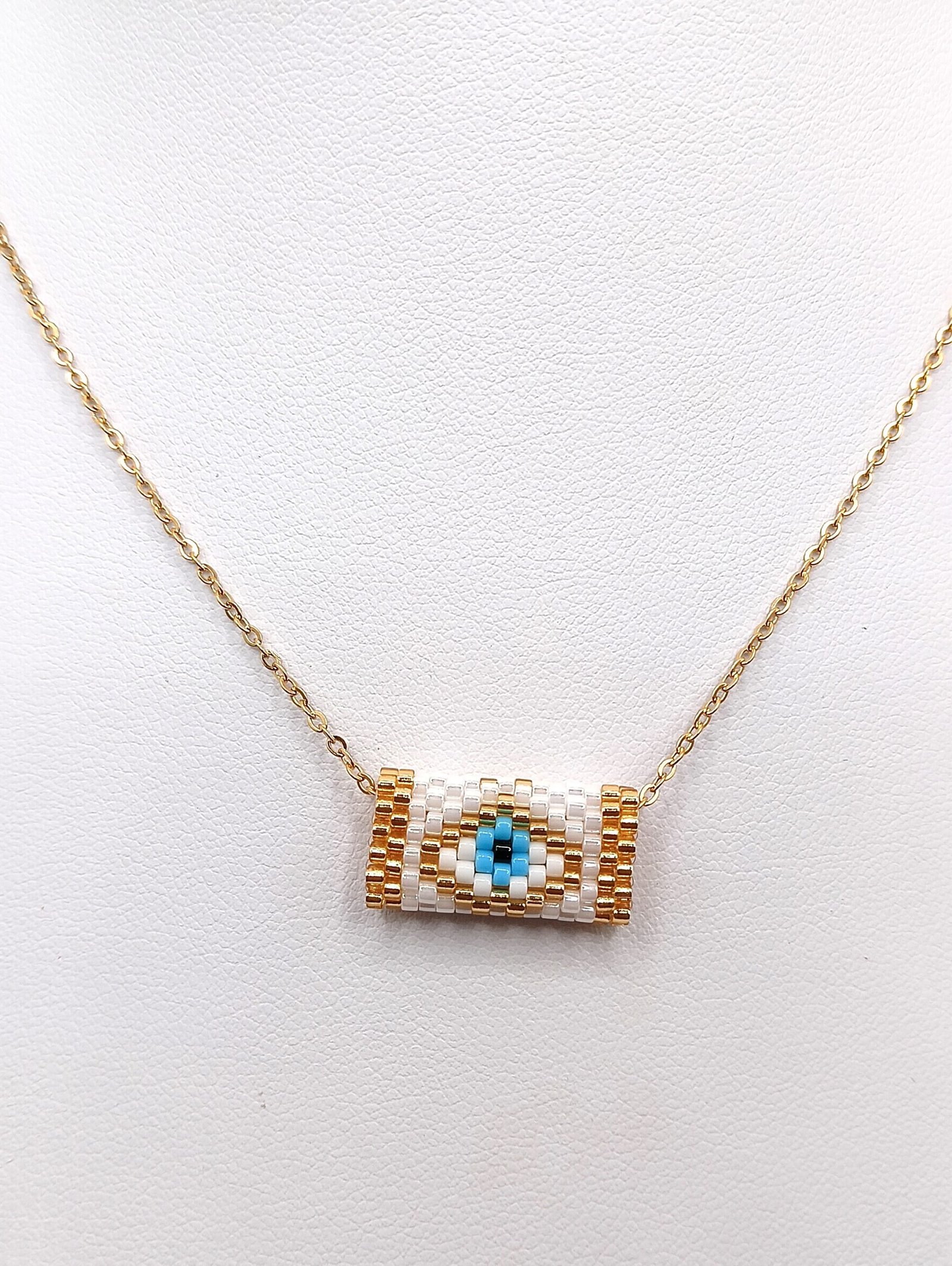Minimal και boho, αυτό το κολιέ συνδυάζει χρυσή ατσάλινη αλυσίδα με χειροποίητο στοιχείο από αυθεντικές ιαπωνικές χάντρες Miyuki, σε σχέδιο ματιού.