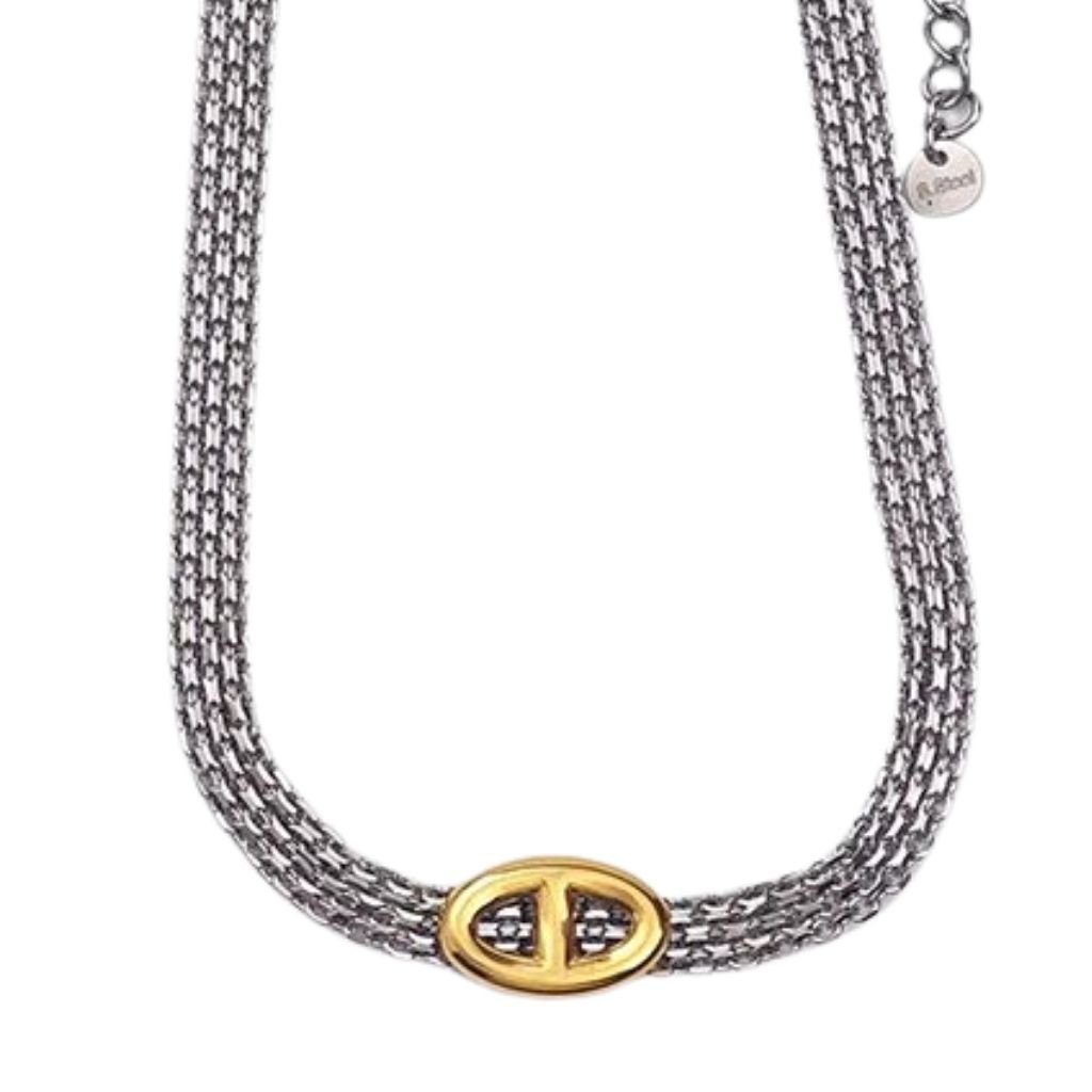Κομψό και μοντέρνο κολιέ από ανοξείδωτο ατσάλι με πολλαπλές λεπτές αλυσίδες σε ασημί απόχρωση.