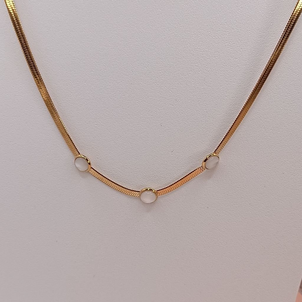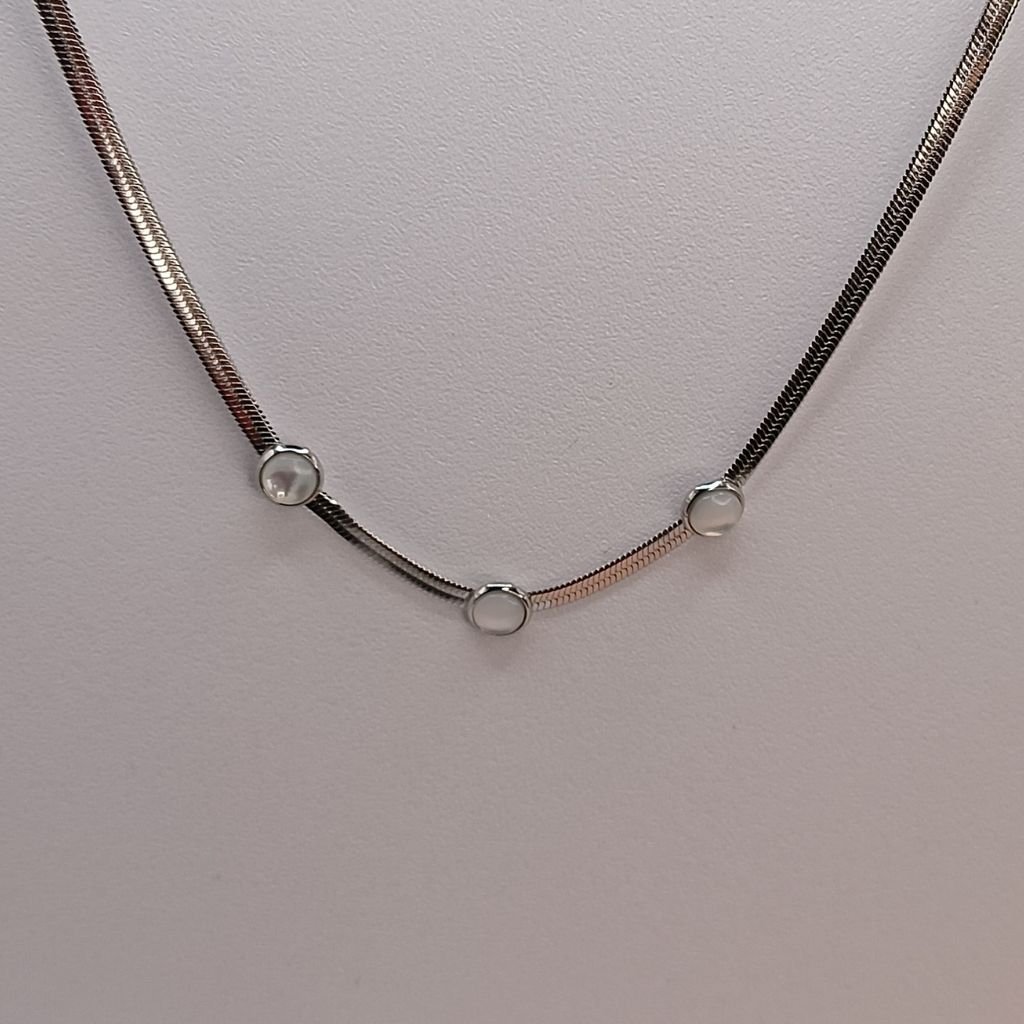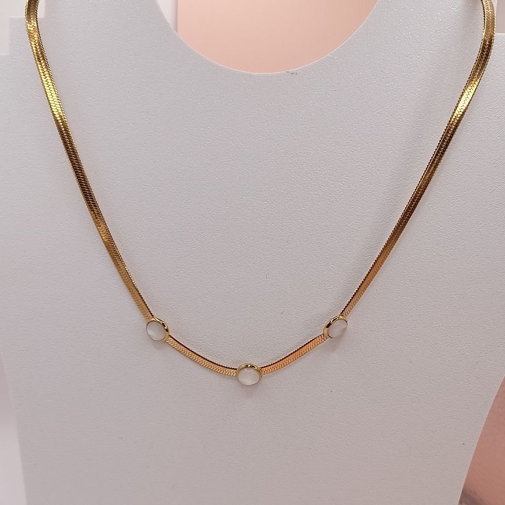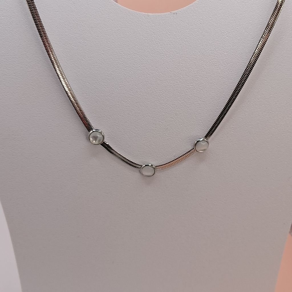 Κομψό ατσάλινο κολιέ σε minimal γραμμή, με τρία στρογγυλά στοιχεία σε όψη μαργαριταριού. Ιδανικό για καθημερινή κομψότητα αλλά και για ιδιαίτερες εμφανίσεις, συνδυάζεται εύκολα με άλλα κοσμήματα. Διατίθεται σε χρυσό και ασημί χρώμα.