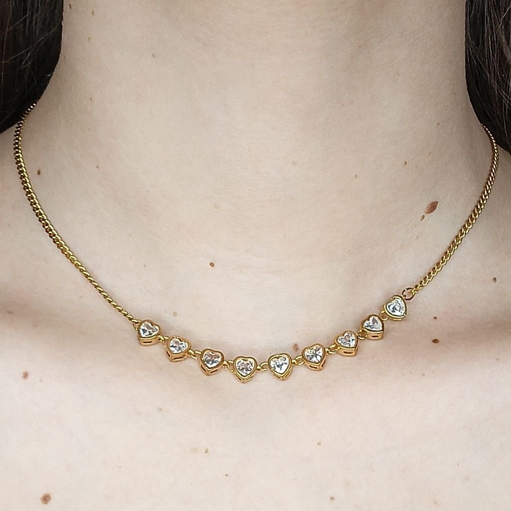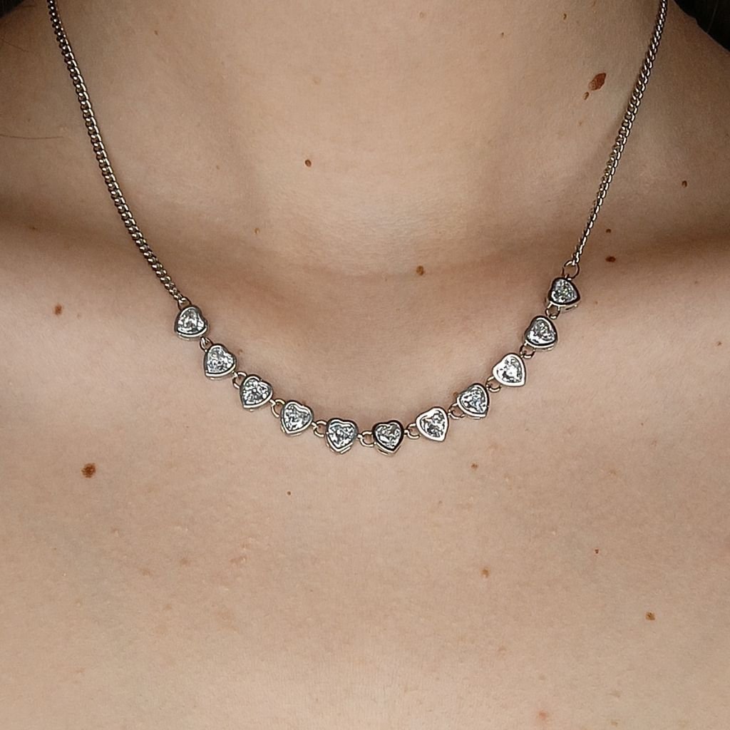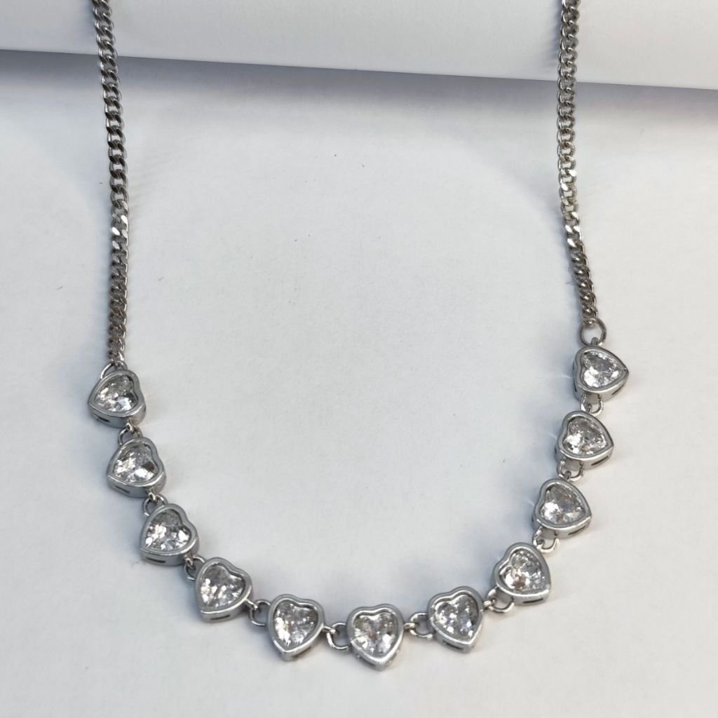 Ρομαντικό και λαμπερό ατσάλινο κολιέ ριβιέρα με μικρές καρδιές, διακοσμημένες με λαμπερά λευκά ζιργκόν που χαρίζουν διακριτική αλλά εντυπωσιακή λάμψη. Ένα κόσμημα που αποπνέει θηλυκότητα και κομψότητα, ιδανικό για καθημερινή χρήση αλλά και για πιο ιδιαίτερες εμφανίσεις.