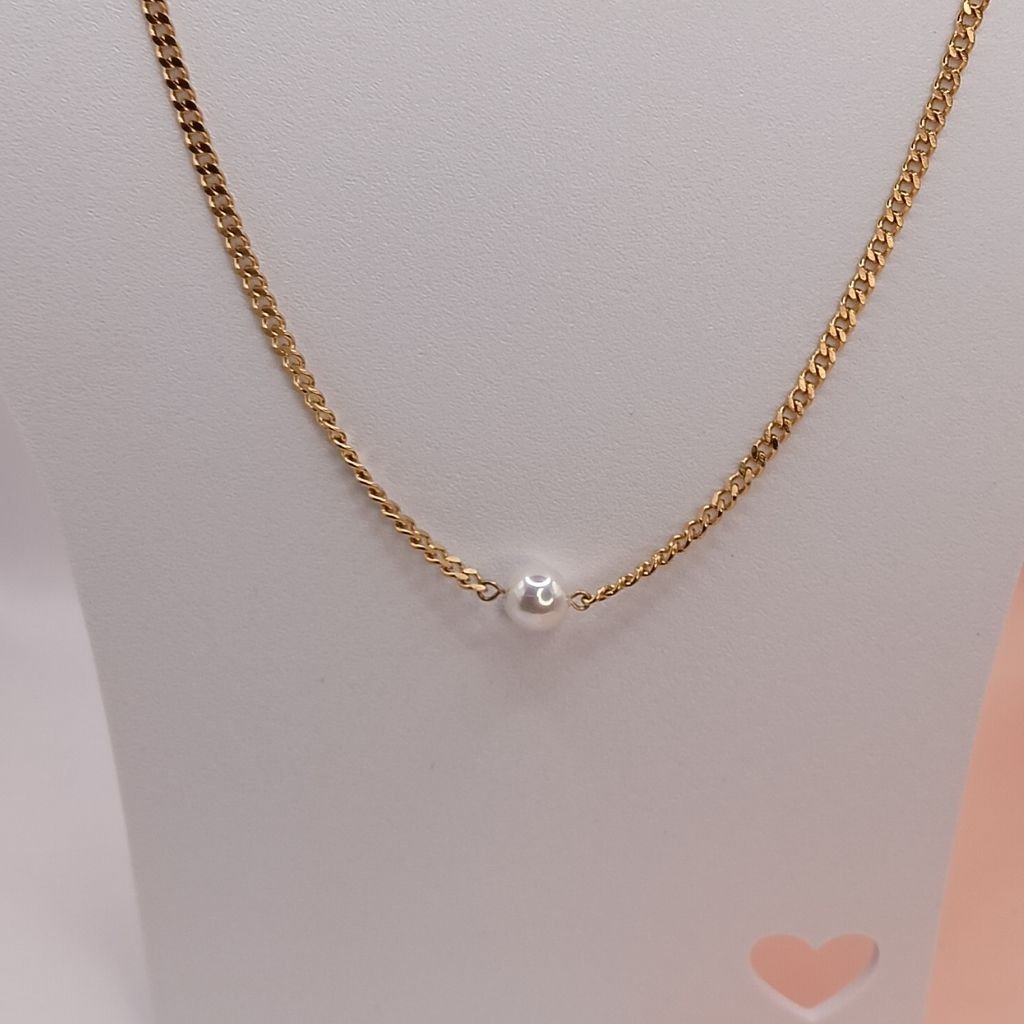 Κομψό κολιέ από ανοξείδωτο ατσάλι σε χρυσή απόχρωση, διακοσμημένο με μία λευκή πέρλα στο κέντρο. Μίνιμαλ και διαχρονικό σχέδιο που ταιριάζει σε κάθε στυλ και περίσταση. Ιδανικό για να φορεθεί μόνο του ή σε layering με άλλα κολιέ.