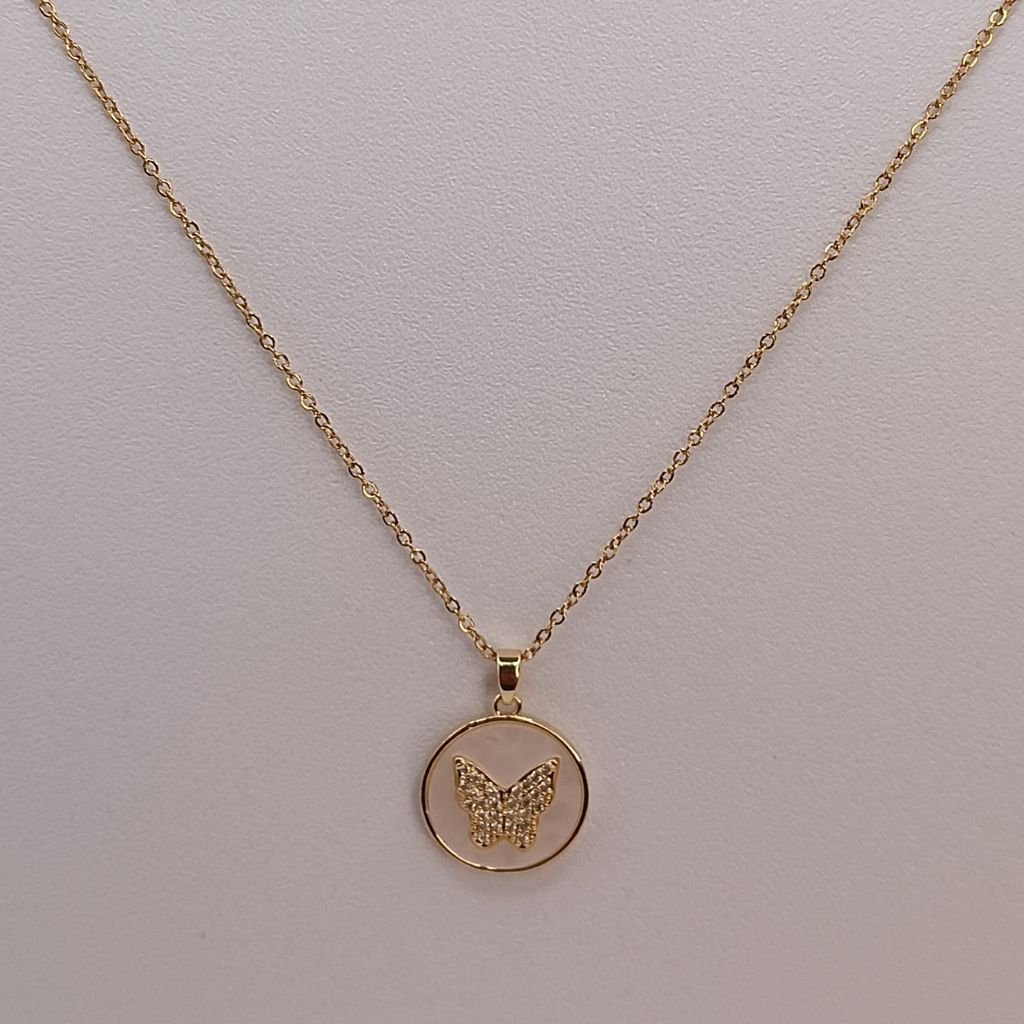 Κομψό κολιέ από ανοξείδωτο ατσάλι σε χρυσό χρώμα, με μενταγιόν στρογγυλό που φιλοξενεί μια λαμπερή πεταλούδα διακοσμημένη με ζιργκόν. Ένα μοντέρνο και ταυτόχρονα ρομαντικό κόσμημα, ιδανικό για όλες τις ώρες της ημέρας.