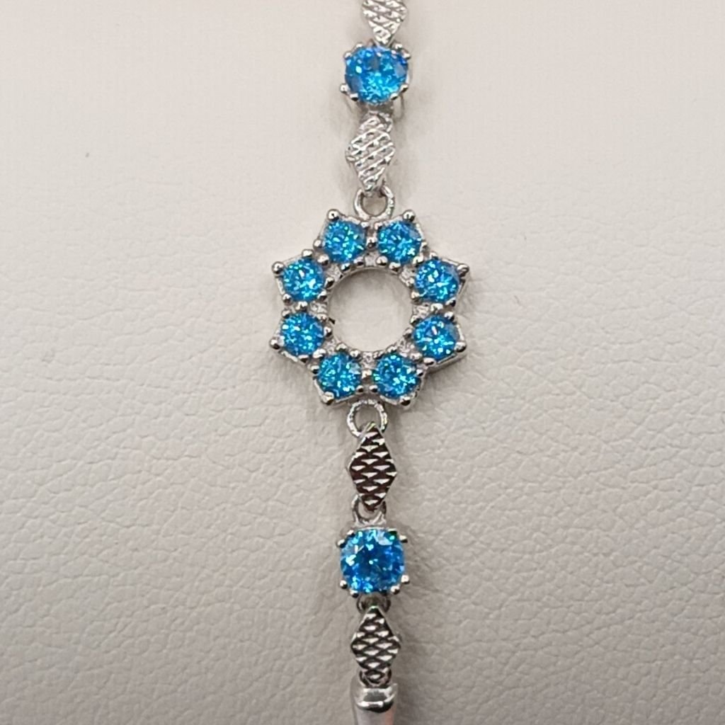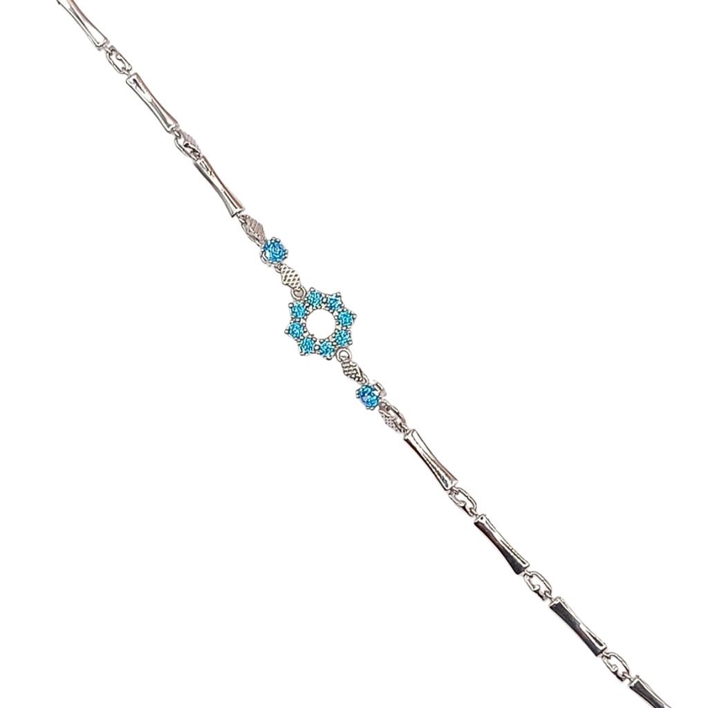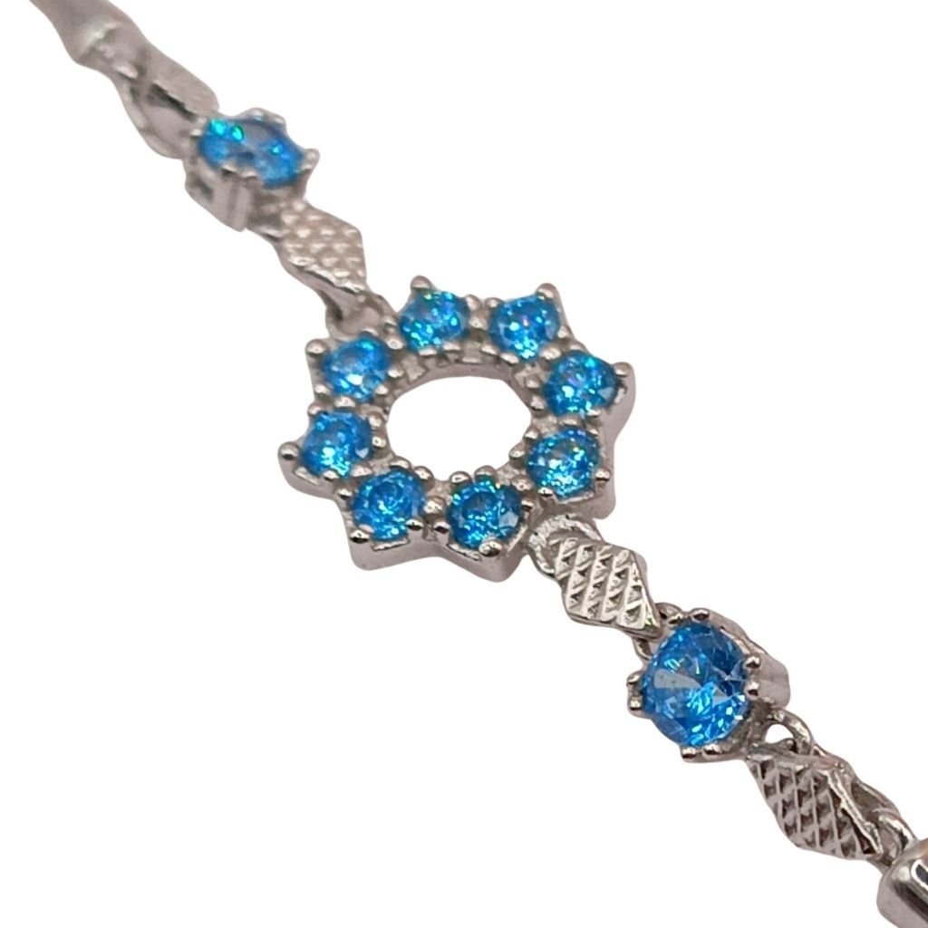 Κομψό βραχιόλι από ασήμι 925 με καδένα τύπου bar link και κεντρικό μοτίφ σε σχήμα αστεριού, διακοσμημένο με λαμπερά γαλάζια ζιργκόν. Ένα κόσμημα που συνδυάζει φινέτσα και χρώμα, χαρίζοντας μια ξεχωριστή πινελιά σε κάθε εμφάνιση. Ιδανικό για δώρο ή για να φωτίσει τη δική σας συλλογή κοσμημάτων.