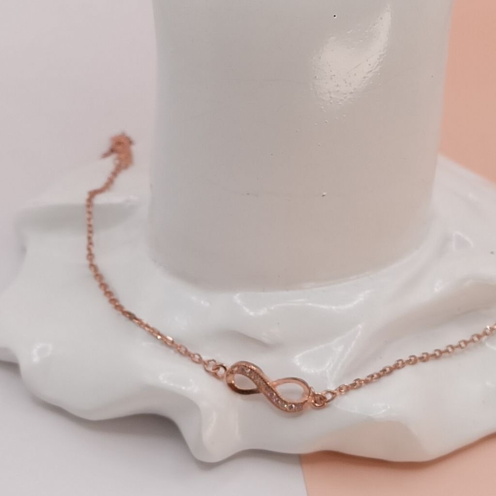 Κομψό γυναικείο βραχιόλι από ασήμι 925 με ροζ επιχρύσωμα, διακοσμημένο με το σύμβολο του απείρου στολισμένο με λευκά ζιργκόν. Ιδανικό δώρο αγάπης και φιλίας, που ταιριάζει σε κάθε εμφάνιση.