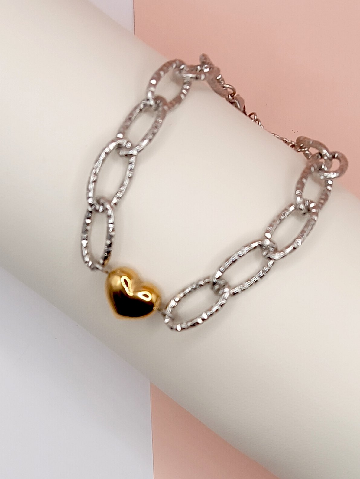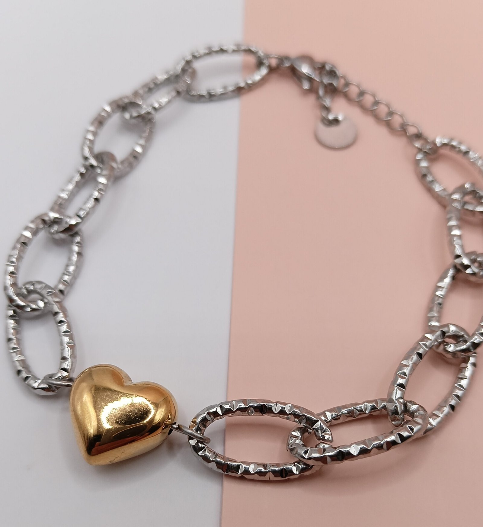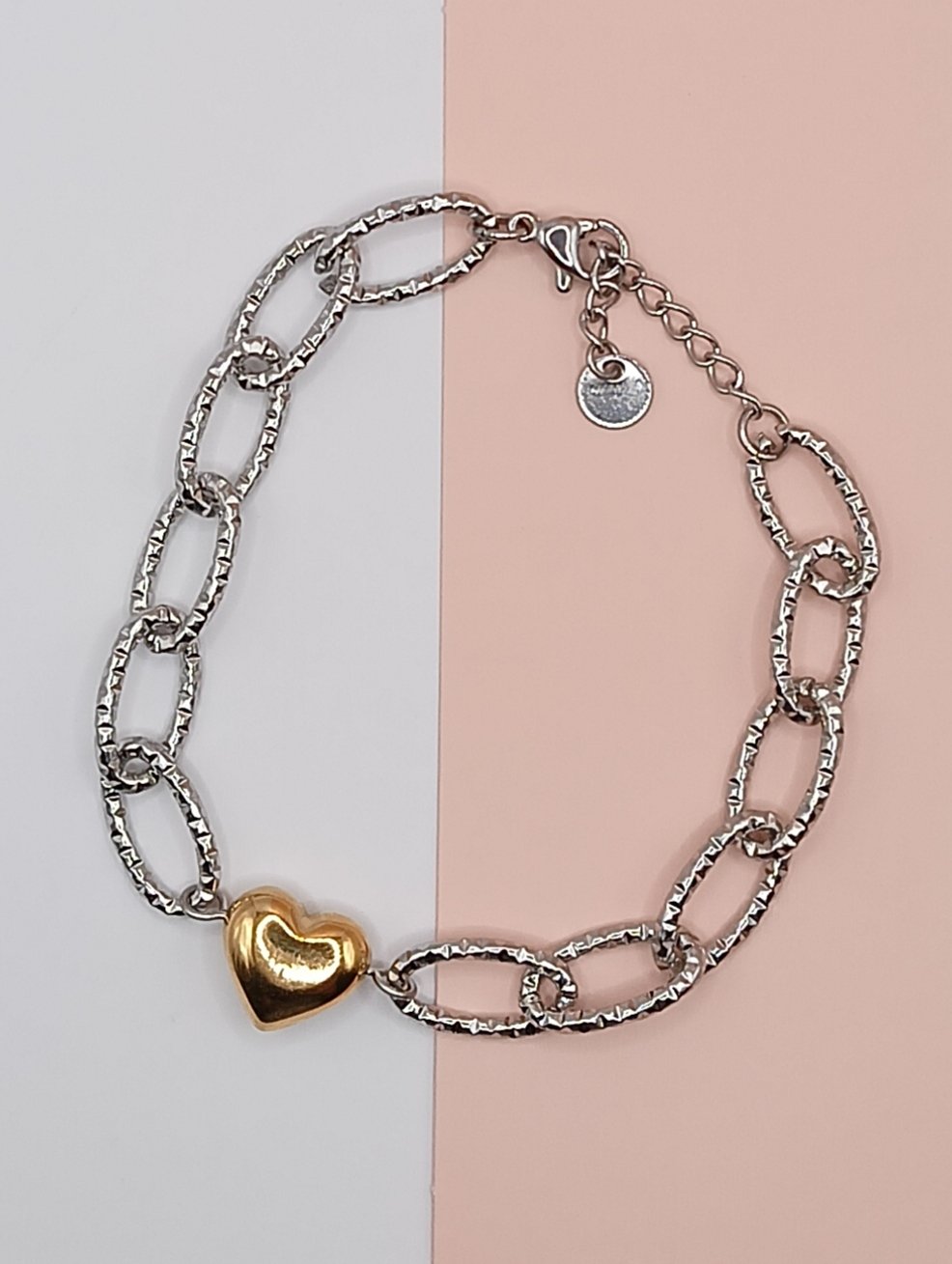 Μοντέρνο και εντυπωσιακό, αυτό το δίχρωμο βραχιόλι συνδυάζει την ασημί ανάγλυφη αλυσίδα με ένα χρυσό ατσάλινο charm σε σχήμα καρδιάς.