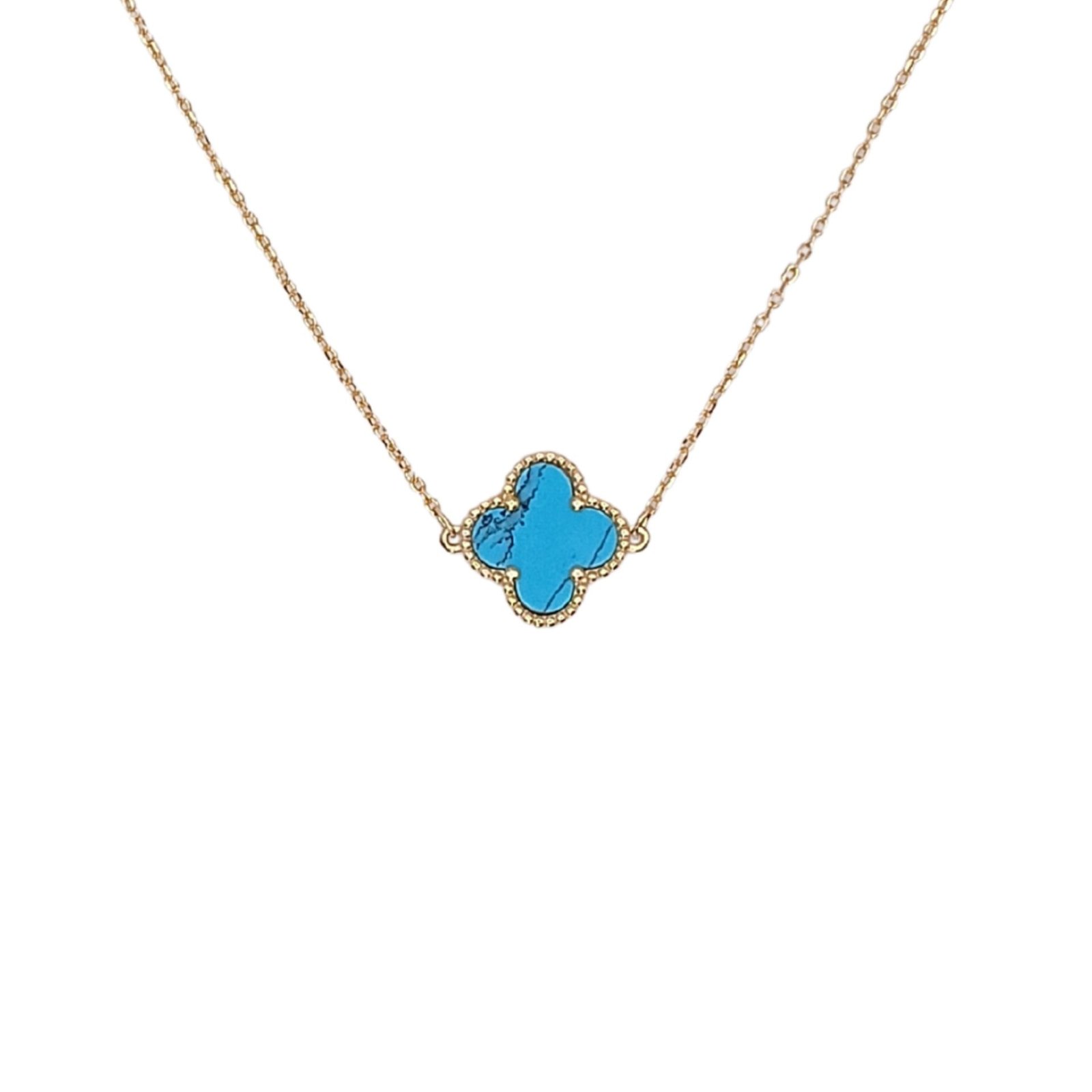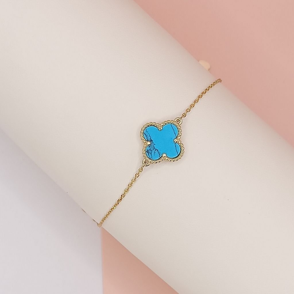 Κομψό βραχιόλι από επιχρυσωμένο ασήμι 925 με λεπτή αλυσίδα και κεντρικό μοτίφ σε σχήμα τετράφυλλου τριφυλλιού, διακοσμημένο με γαλάζια πέτρα τιρκουάζ. Ένα δροσερό και διακριτικό κόσμημα που χαρίζει χρώμα και στυλ σε κάθε εμφάνιση. Το τετράφυλλο θεωρείται σύμβολο τύχης, καθιστώντας το ιδανικό δώρο για αγαπημένα πρόσωπα.