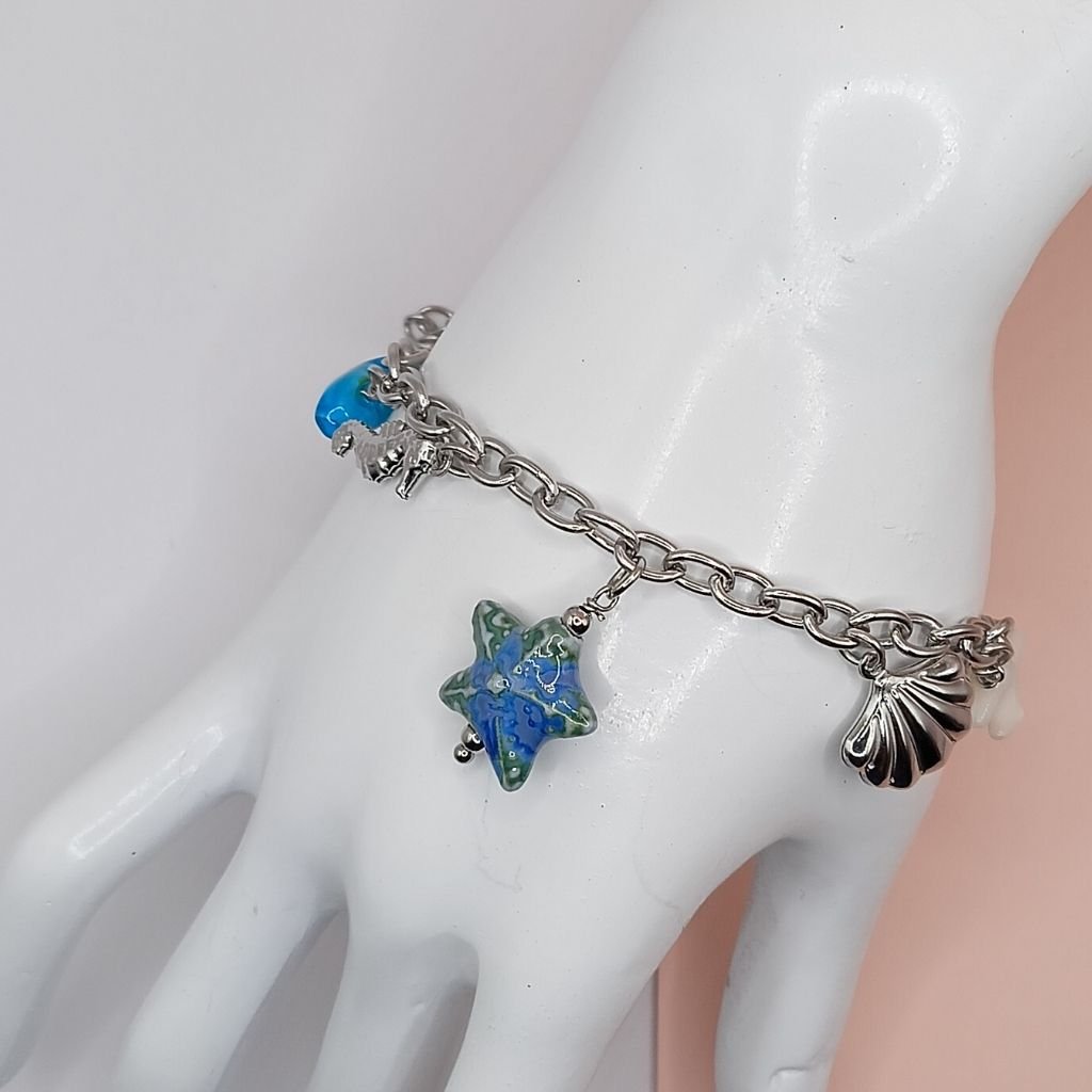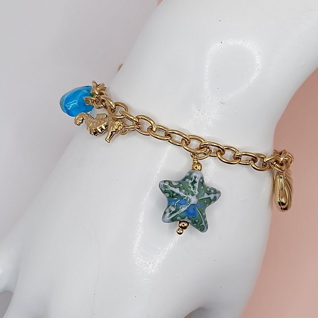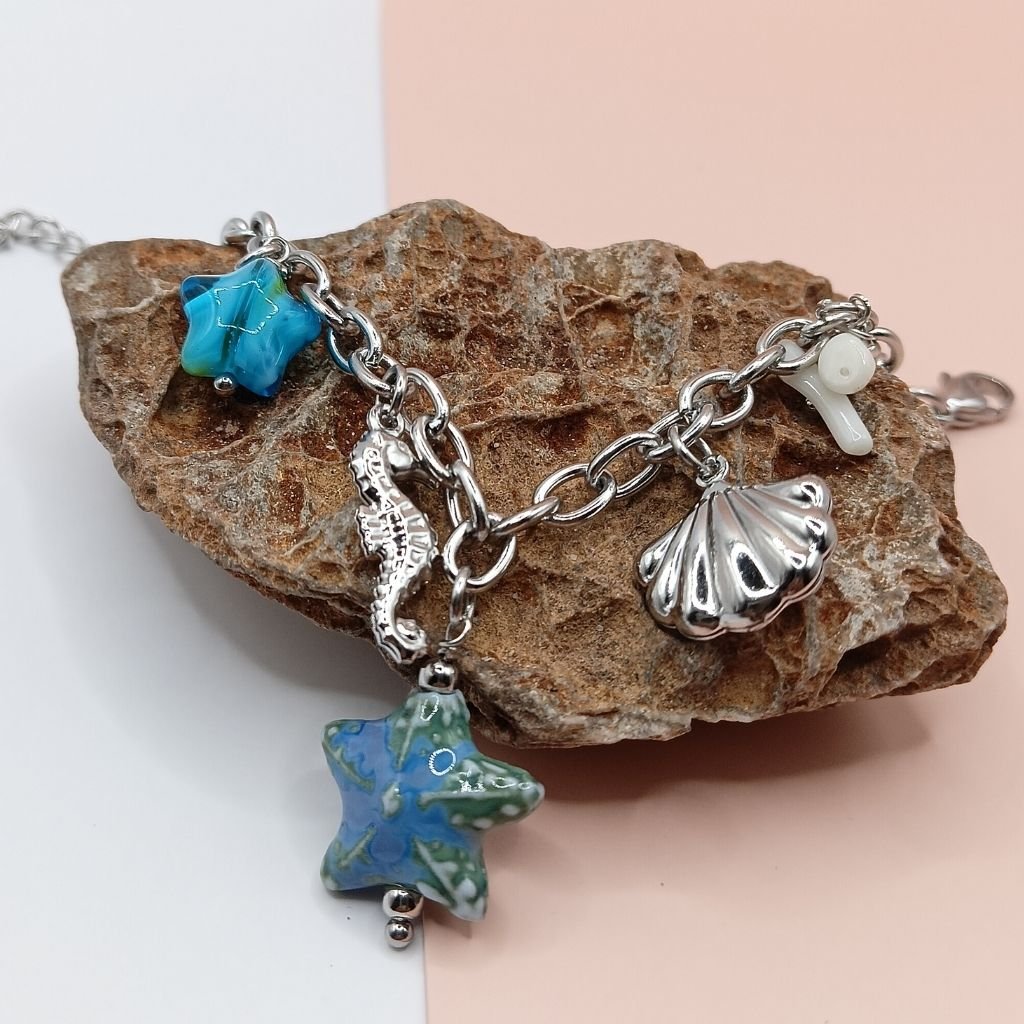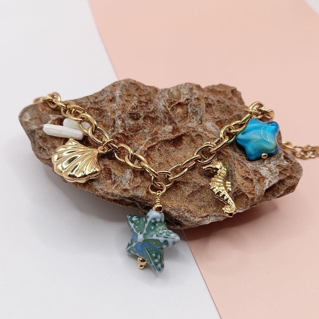 Καλοκαιρινό βραχιόλι με αλυσίδα σε χρυσό ή ασημί χρώμα, διακοσμημένο με πολύχρωμο charm αστερία, γαλάζιες πέτρες και μικρά στοιχεία από τον βυθό όπως κοχύλι και ιππόκαμπο. Ιδανικό για να φέρεις τη θάλασσα… στο χέρι σου!
