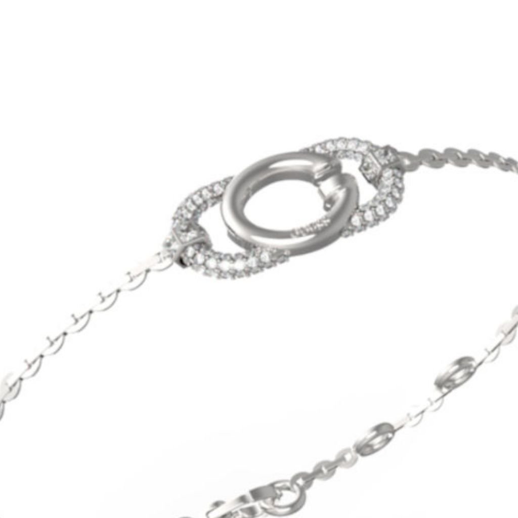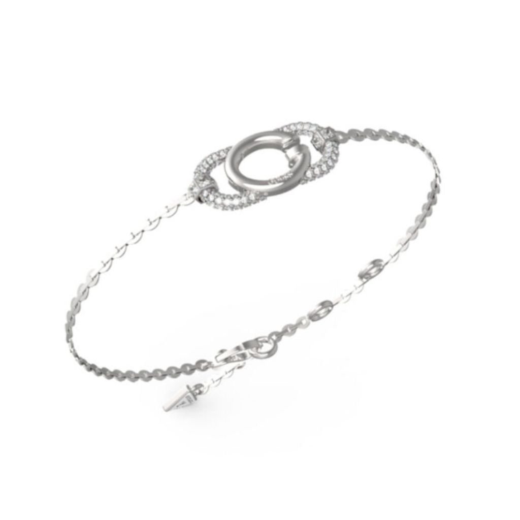 Λεπτό και κομψό βραχιόλι GUESS από ανοξείδωτο ατσάλι σε ασημί χρώμα, με διακριτική αλυσίδα και εντυπωσιακό κεντρικό στοιχείο διακοσμημένο με λευκά ζιργκόν. Το λαμπερό μοτίβο θυμίζει κρίκο, προσφέροντας μοντέρνα αισθητική και διαχρονική κομψότητα. Φοριέται άνετα μόνο του ή συνδυασμένο με άλλα βραχιόλια για ένα πιο εντυπωσιακό αποτέλεσμα.