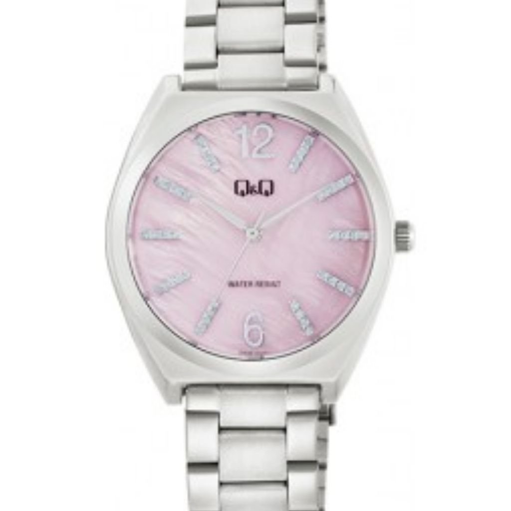 Κομψό και μοντέρνο ρολόι Q&Q με μπρασελέ από ανοξείδωτο ατσάλι και εντυπωσιακό ροζ καντράν με μαργαριταρένια υφή. Οι λαμπερές λεπτομέρειες στους δείκτες και στους αριθμούς προσθέτουν μια κομψή πινελιά. Ιδανικό για καθημερινή χρήση αλλά και πιο επίσημες περιστάσεις.