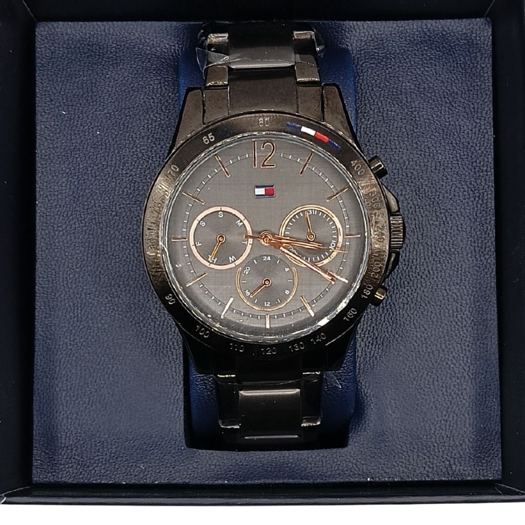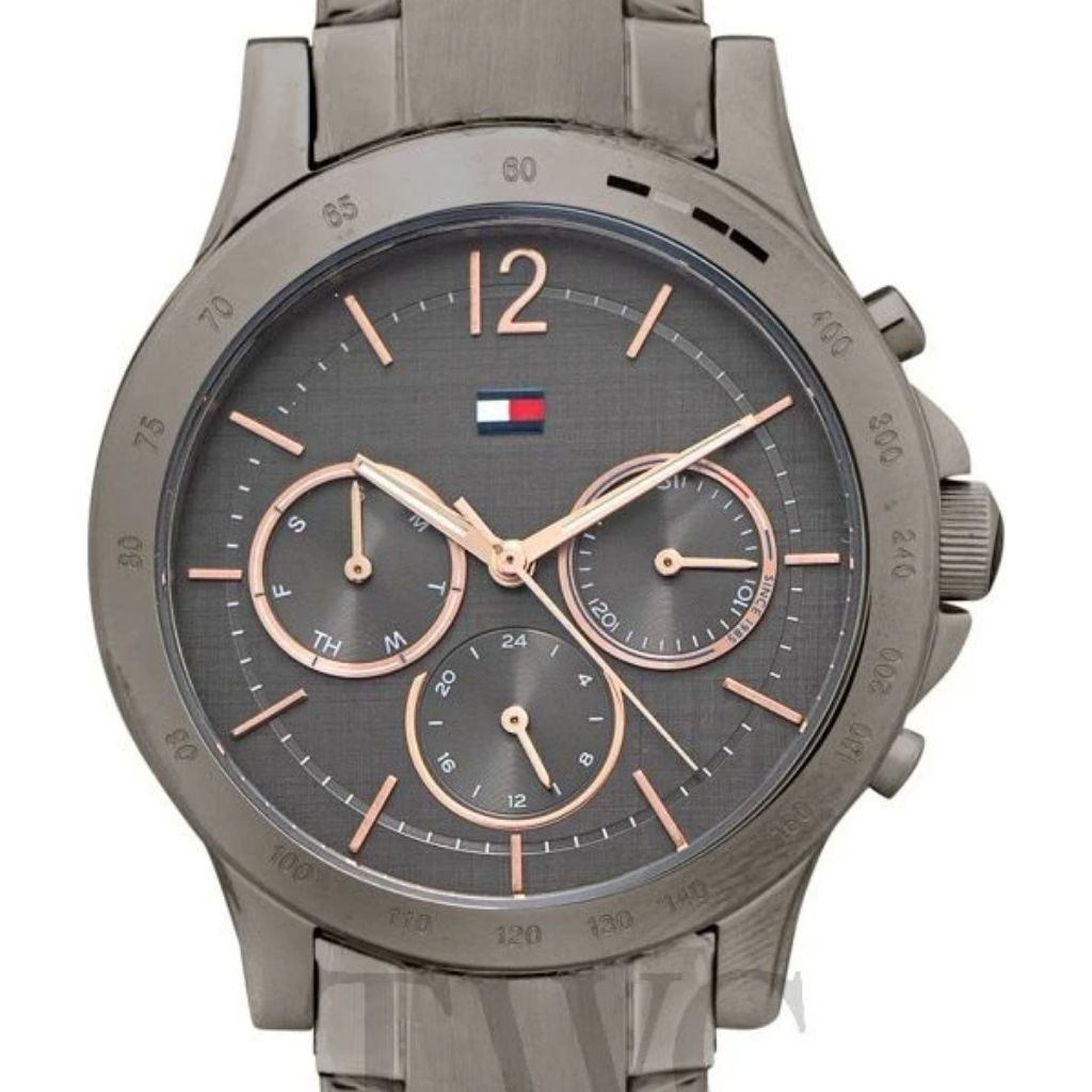 Στυλάτο γυναικείο ρολόι Tommy Hilfiger με μπρασελέ σε ανθρακί απόχρωση και μαύρο καντράν. Διαθέτει διακριτικές λεπτομέρειες σε ροζ χρυσό που χαρίζουν κομψότητα και μοντέρνο ύφος. Ανθεκτικό στο νερό έως 5 ΑΤΜ για καθημερινή χρήση.