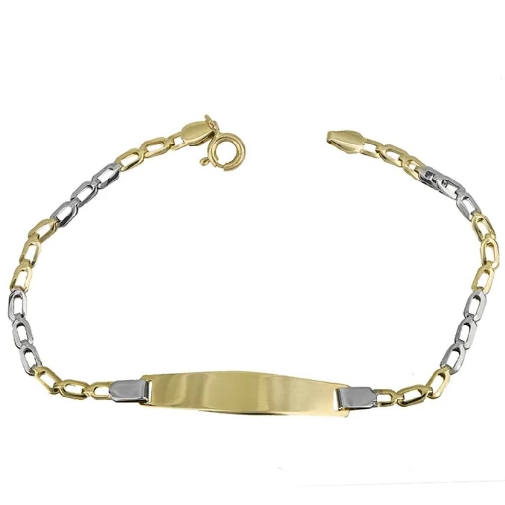 Παιδική ταυτότητα από κίτρινο και λευκό χρυσό 14 καρατίων σε κλασικό σχέδιο που μπορεί να φορεθεί και από αγοράκι αλλά και κοριτσάκι.