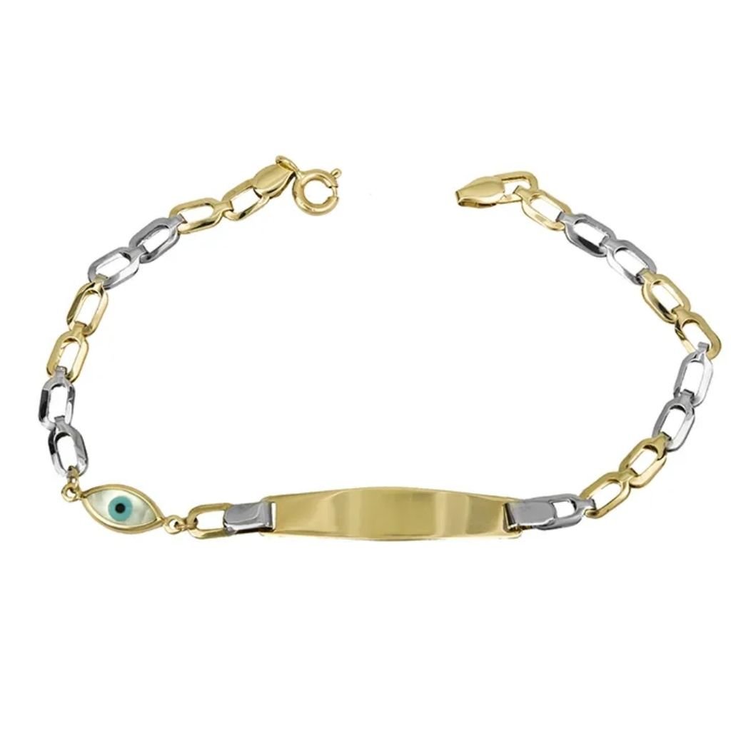 Υπέροχη παιδική ταυτότητα σε διχρωμία λευκού και κίτρινου χρυσού στα 14 καράτια διακοσμημένη με ένα φίλντισι ματάκι. Ιδανική για να κάνετε δώρο σε ένα νεογέννητο μωράκι!